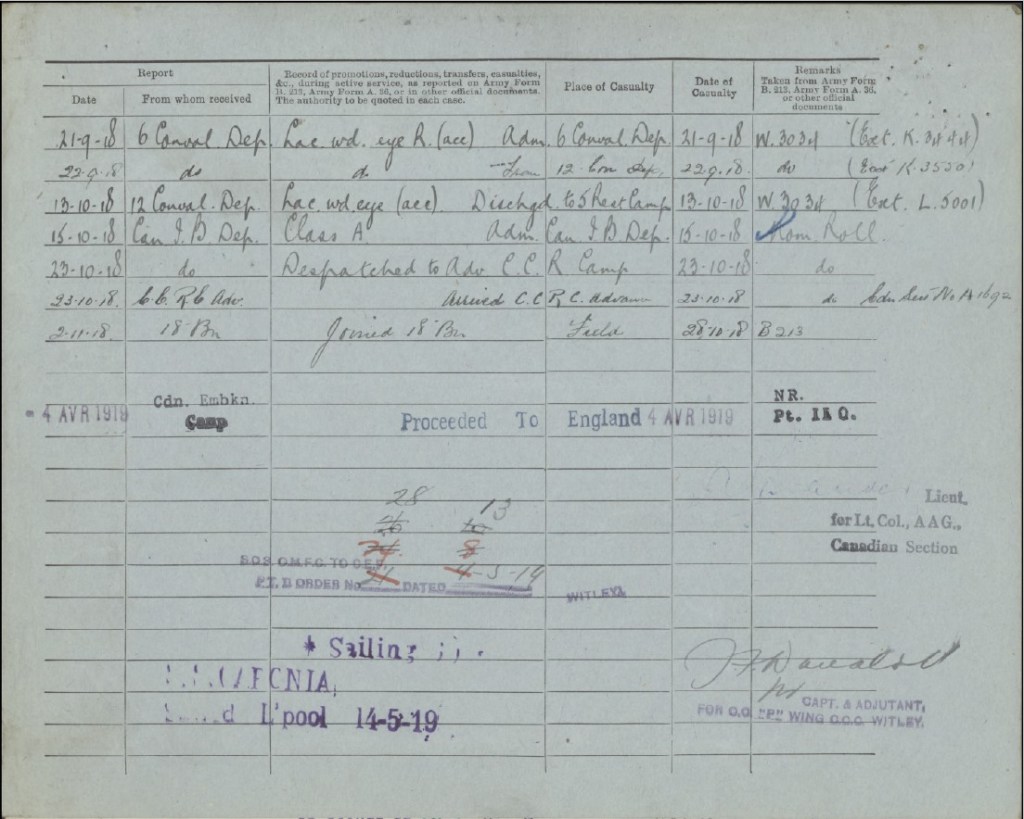 | Other details | A Coy – Was returning to camp from etaples when he was knocked down and got a boot to the eye, do not know the names of the men who did it |