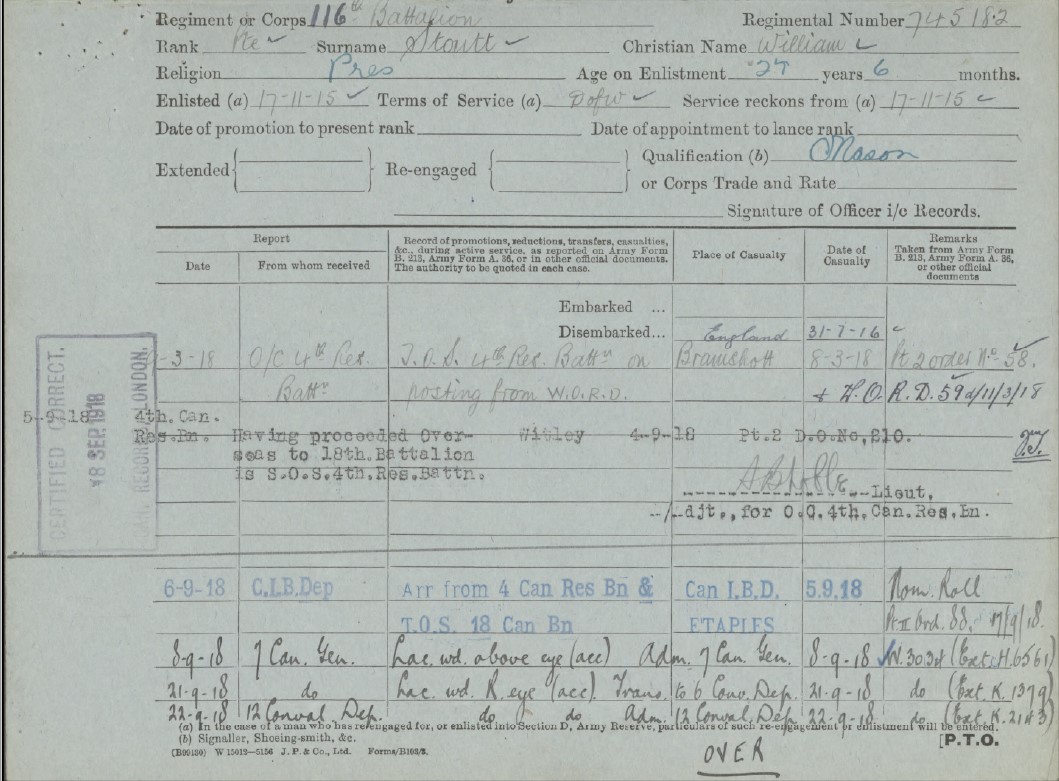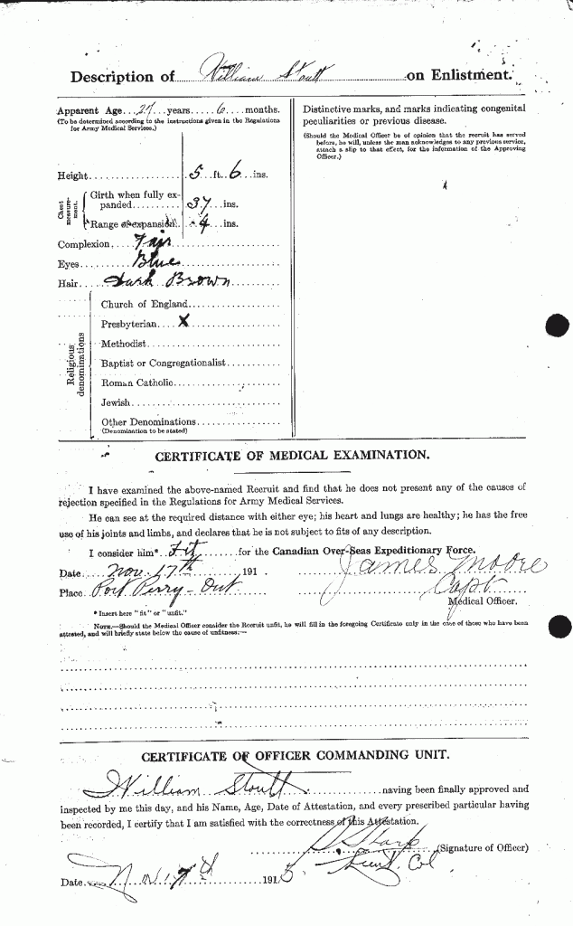 Family Search: William Stoutt was born on 1 May 1889, in Port Perry, Ontario, Ontario, Canada. He registered for military service in 1915. In 1915, at the age of 26, his occupation is listed as mason in Port Perry, Ontario, Ontario, Canada. He died in 1959, in Ontario, Canada, at the age of 70.