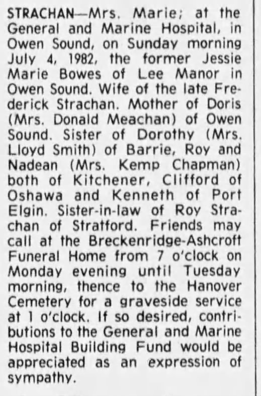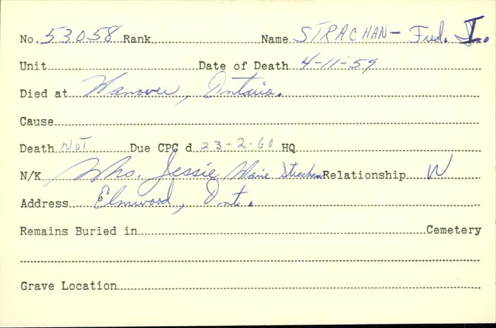 Family Search: Frederick Ivel Strachan was born on 23 September 1896, in Harriston, Minto, Wellington, Ontario, Canada as the son of Edward Strachan and Blanche Davis. He had at least 1 daughter with Jesse Marie Bowes. He died on 4 November 1959, in Elmwood, Brockton, Bruce, Ontario, Canada, at the age of 63, and was buried in Hanover Cemetery, Hanover, Grey, Ontario, Canada.
