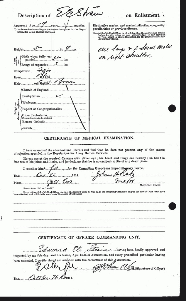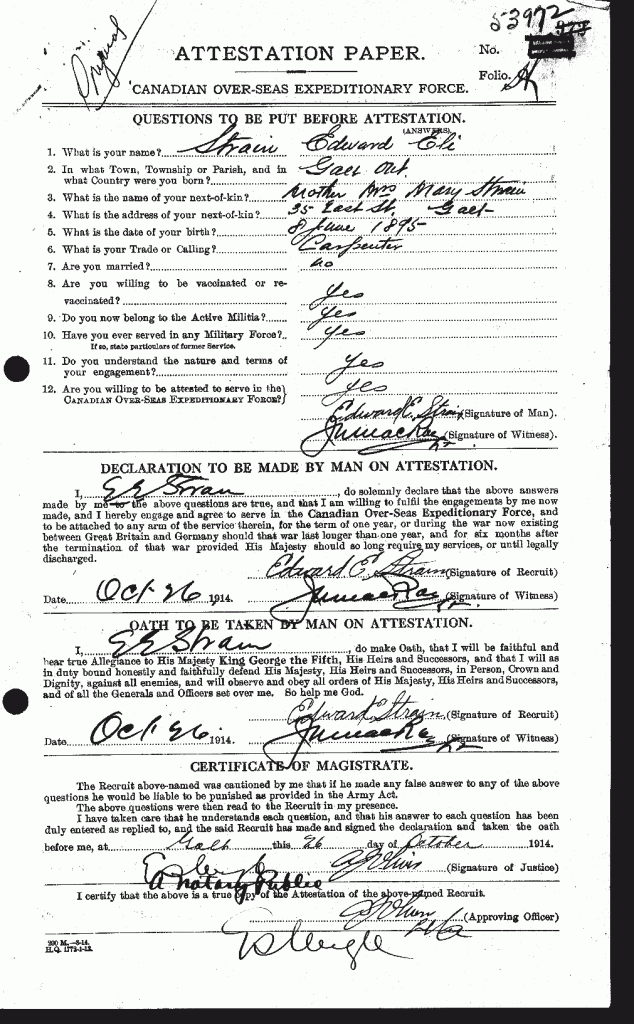 Family Search: When Edward Elias Strain was born on 7 June 1896, in Galt, Waterloo, Ontario, Canada, his father, Joseph B. Strain, was 35 and his mother, Mary Mina Stubbs, was 24. He lived in Waterloo, Ontario, Canada for about 10 years. He registered for military service in 1914. In 1914, at the age of 18, his occupation is listed as carpenter. He died in 1969, at the age of 73, and was buried in Mount View Cemetery, Cambridge, Waterloo, Ontario, Canada