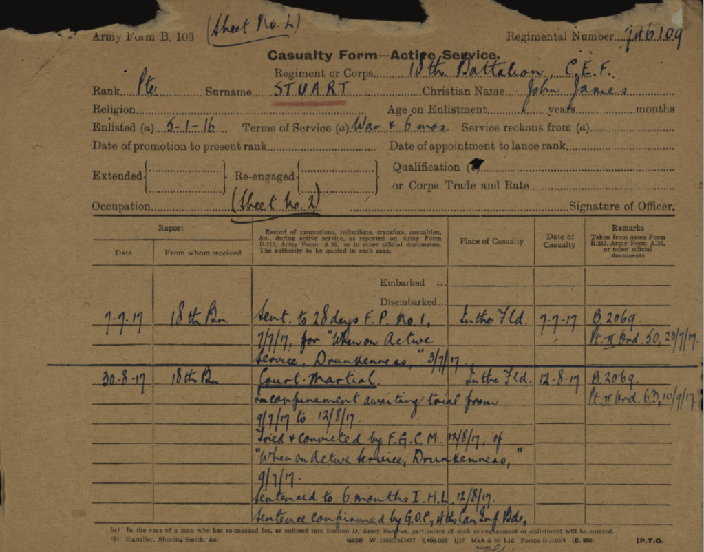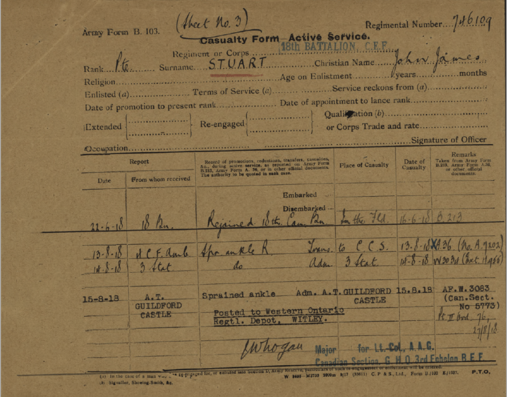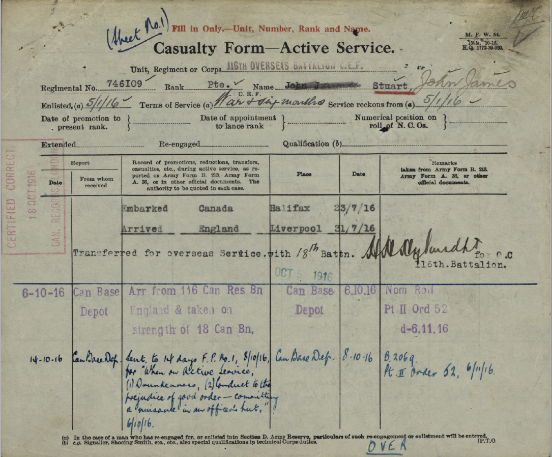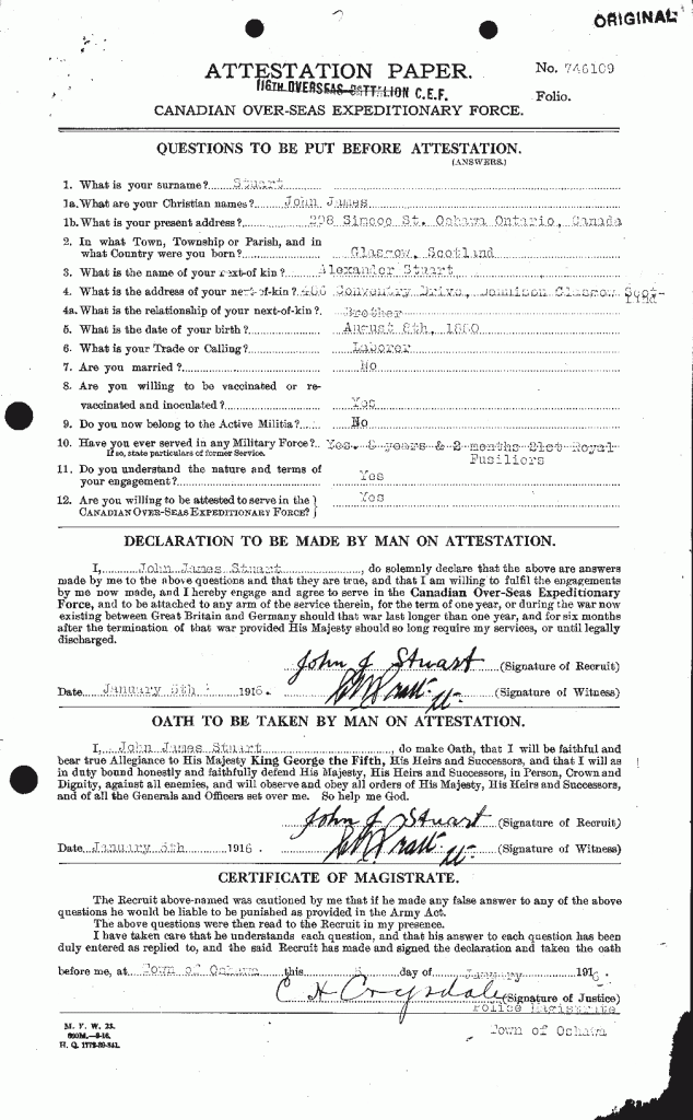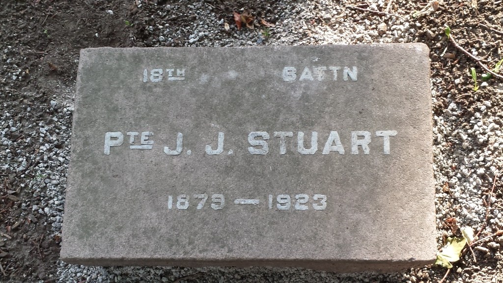 Family Search: Private John James Stuart was born on 8 August 1880, in Glasgow, Scotland, United Kingdom. He immigrated to Canada in 1913 and lived in Oshawa, Durham, Ontario, Canada in 1916. He registered for military service in 1916. In 1916, at the age of 36, his occupation is listed as labourer in Oshawa, Durham, Ontario, Canada. He died on 16 April 1923, in Toronto, Ontario, Canada, at the age of 42, and was buried in Prospect Cemetery, Toronto, Ontario, Canada.