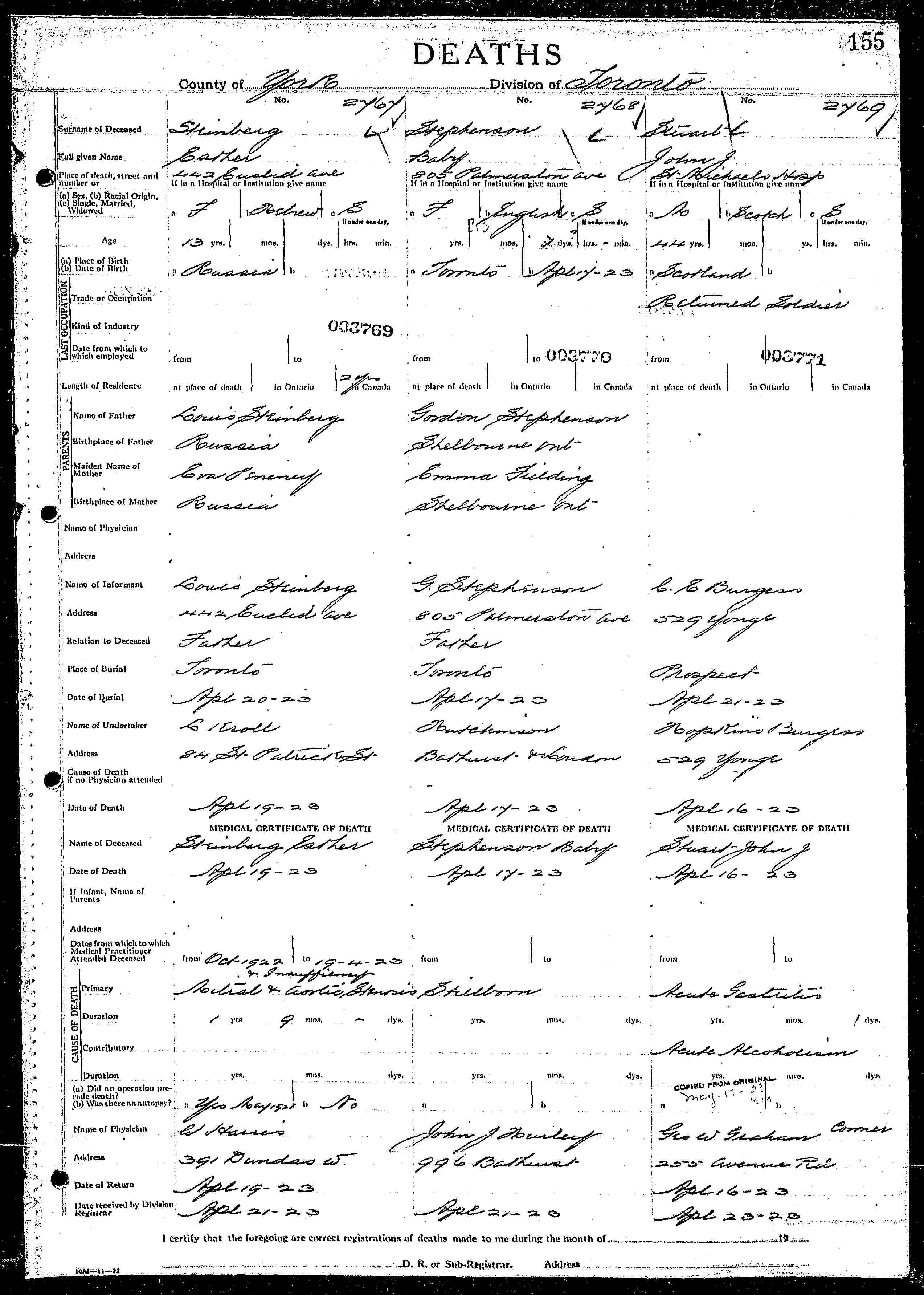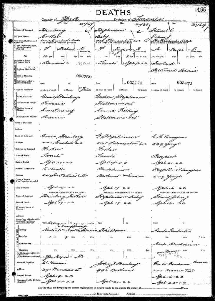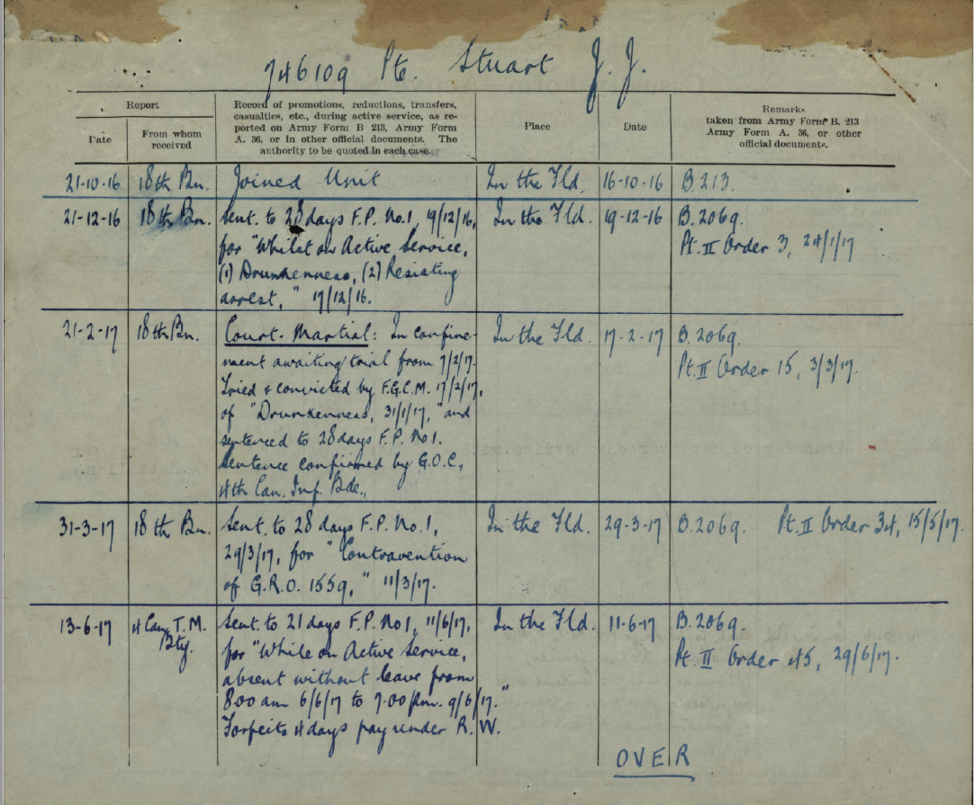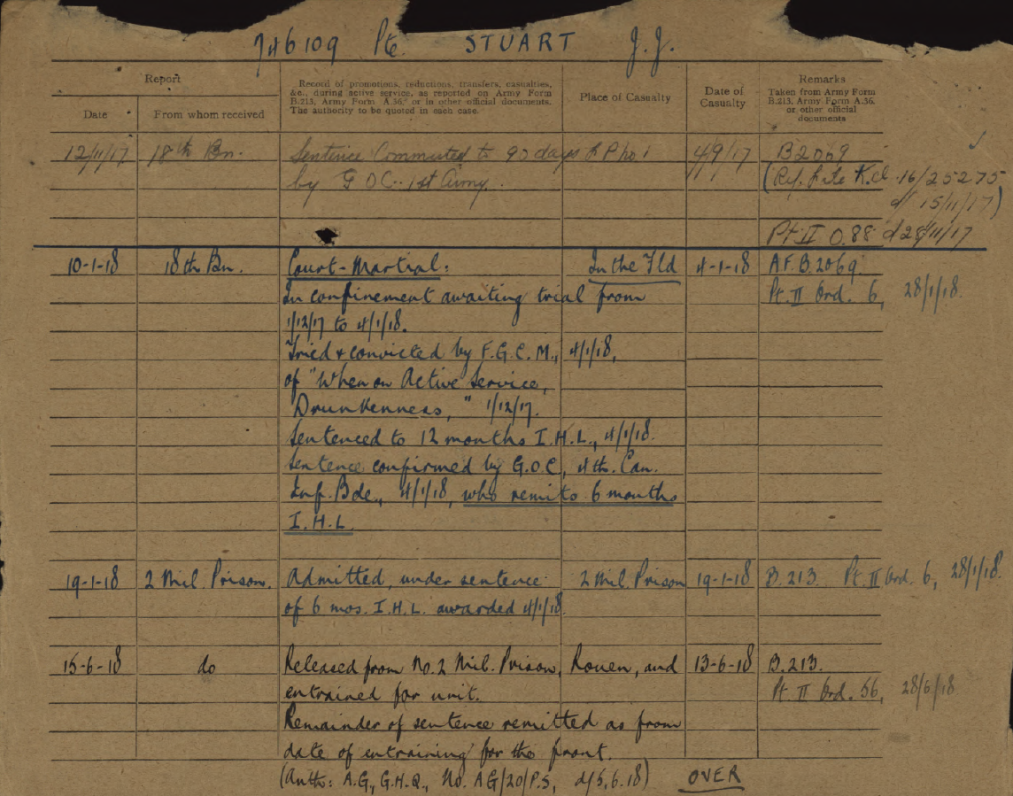 Family Search: Private John James Stuart was born on 8 August 1880, in Glasgow, Scotland, United Kingdom. He immigrated to Canada in 1913 and lived in Oshawa, Durham, Ontario, Canada in 1916. He registered for military service in 1916. In 1916, at the age of 36, his occupation is listed as labourer in Oshawa, Durham, Ontario, Canada. He died on 16 April 1923, in Toronto, Ontario, Canada, at the age of 42, and was buried in Prospect Cemetery, Toronto, Ontario, Canada.