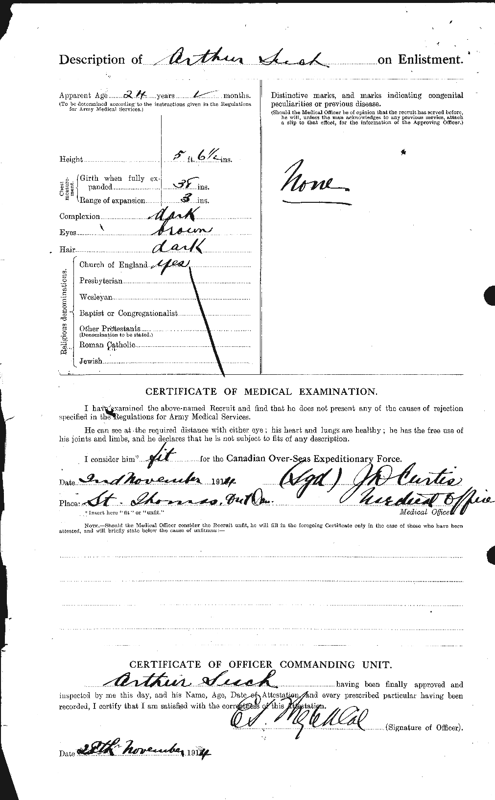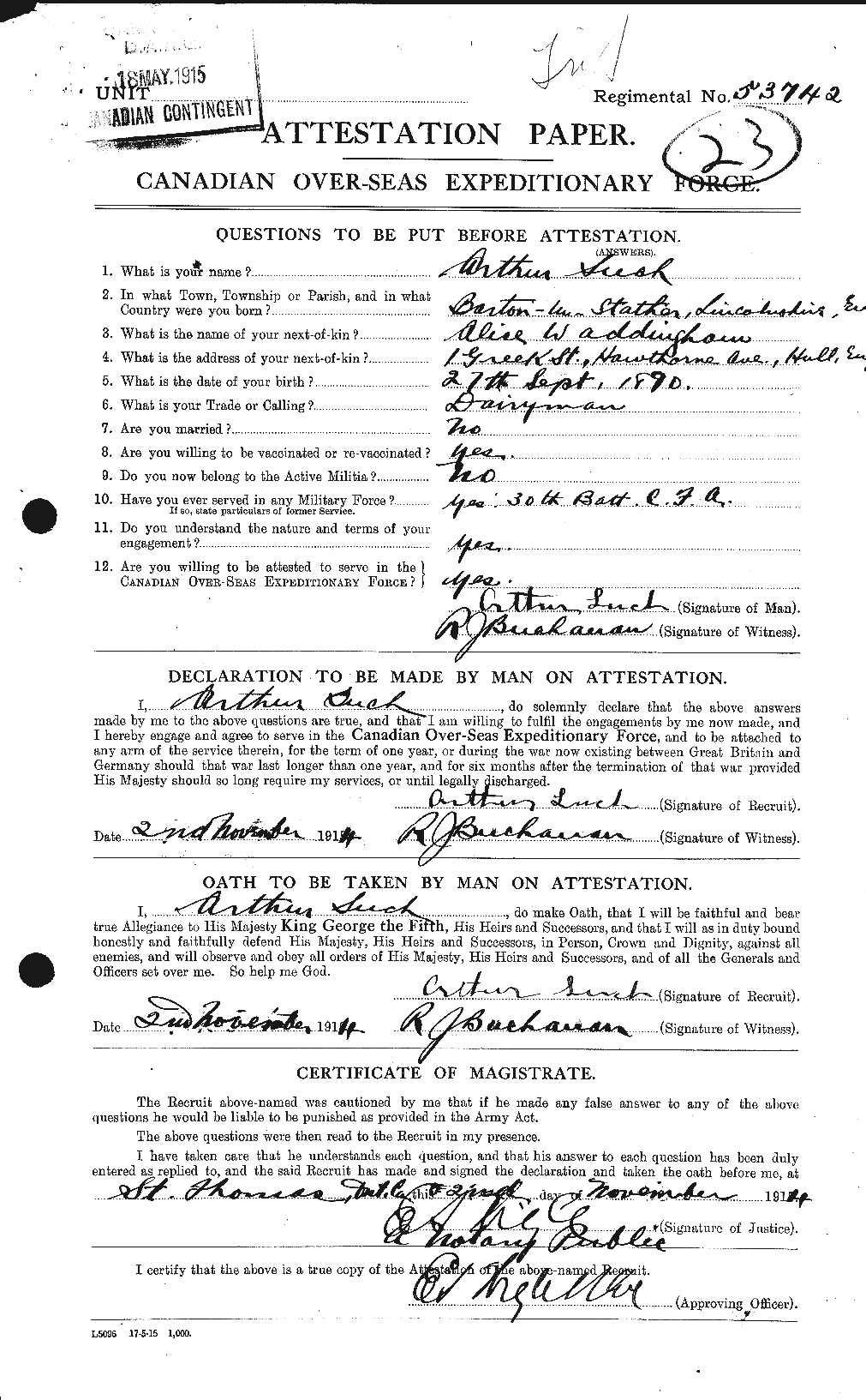 Arthur enlisted for service on November 2, 1914 in St. Thomas. His address is not given, but he states he was born at Barton-Stather, Lincolnshire. He names his next of kin as his mother, Alice Waddingham, of 1 Greek Street, Hawthorne Ave., Hull, England. He was a dairyman, and had served in the 30th Battery, C.F.A.
