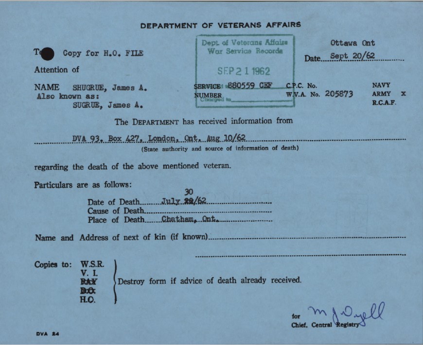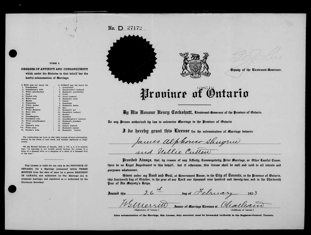 013862-23 James Alphonse SHUGRUE, 35, barber, Paris Ont, Chatham, s/o James SHUGRUE b. Ireland & Annie MORIARITY, married Nellie CUTTEN, 30, widow, linotype operator, London England, Chatham, d/o Harry HATT b. Fulmer Buckinghamshire England & Alice ROBERTSON, witn: Joseph SHUGRUE, Paris Ont, Mrs. Alice HATT, Chatham, 28 February 1923 at Chatham.