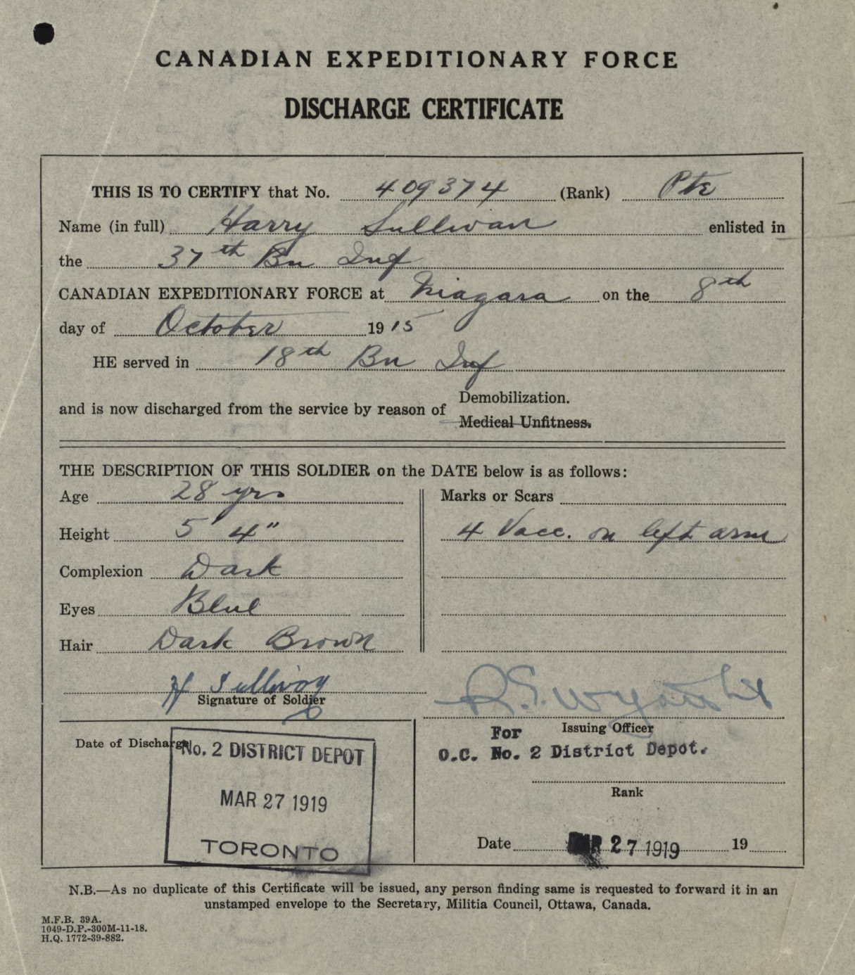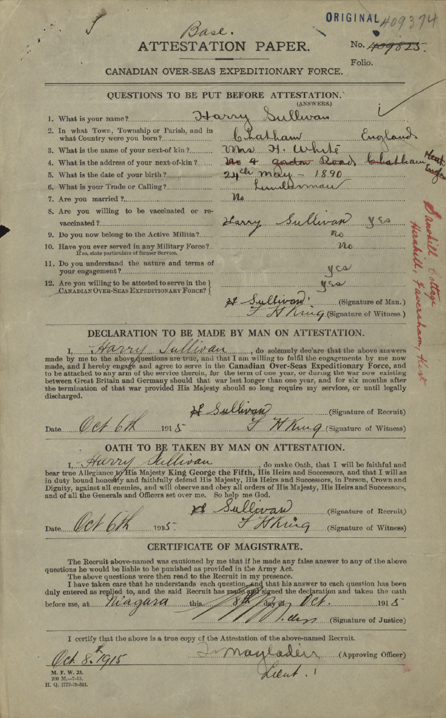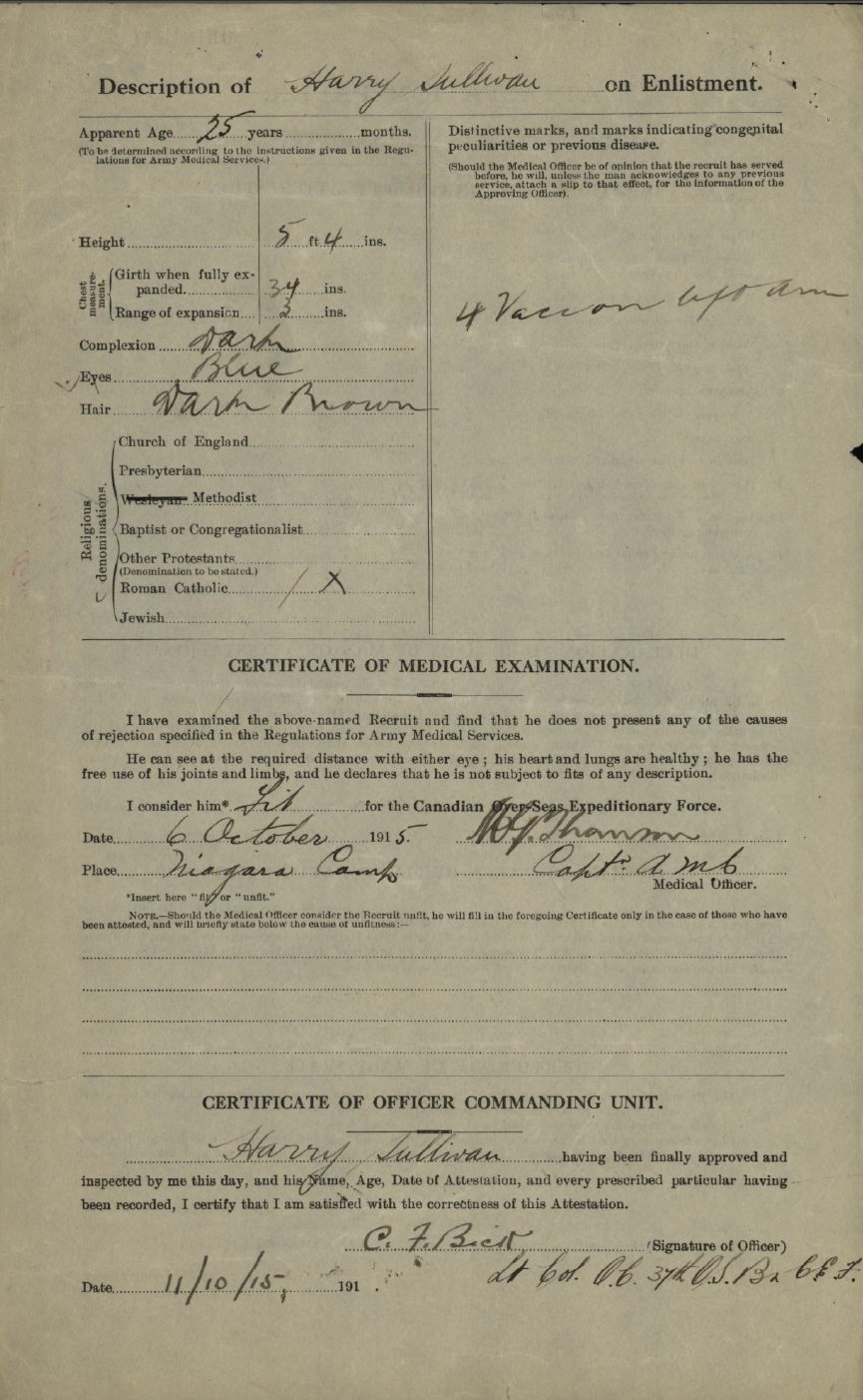 Family Search: Private Harry Sullivan was born on 24 May 1890, in Chatham, Kent, England, United Kingdom as the son of Sullivan and Nellie. He immigrated to Canada in 1913. He registered for military service in 1915. In 1915, at the age of 25, his occupation is listed as lumberman. He died on 29 January 1946, at the age of 55.