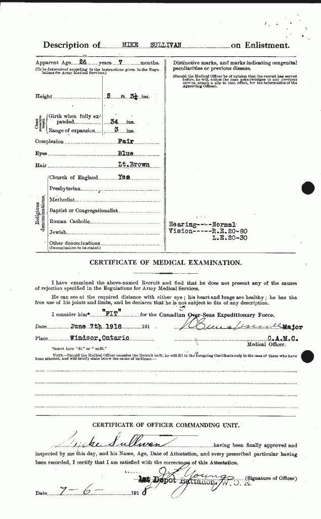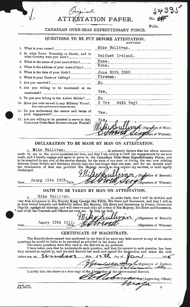 Sullivan, Mike: Service no. 54335 Digitized Service Record Source: 18th Battalion Nominal Roll, April 1915. Find-A-Grave Share this: Click to email a link to a friend (Opens in new window) Email Click to share on Facebook (Opens in new window) Facebook Click to share on X (Opens in new window) X Click to share on Reddit (Opens in new window) Reddit Click to share on LinkedIn (Opens in new window) LinkedIn Click to print (Opens in new window) Print Click to share on Tumblr (Opens in new window) Tumblr Click to share on Pocket (Opens in new window) Pocket Click to share on Pinterest (Opens in new window) Pinterest Click to share on Telegram (Opens in new window) Telegram Click to share on WhatsApp (Opens in new window) WhatsApp Like Loading...