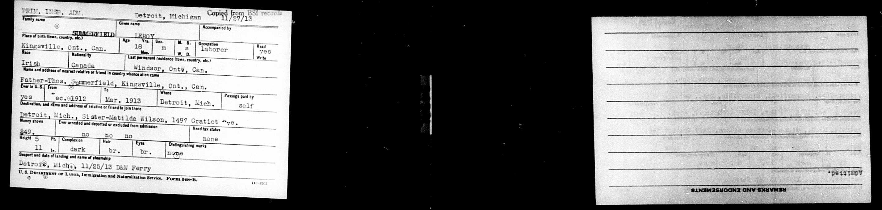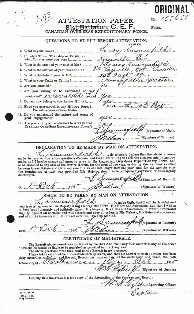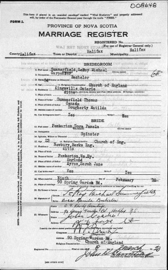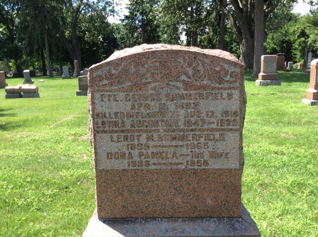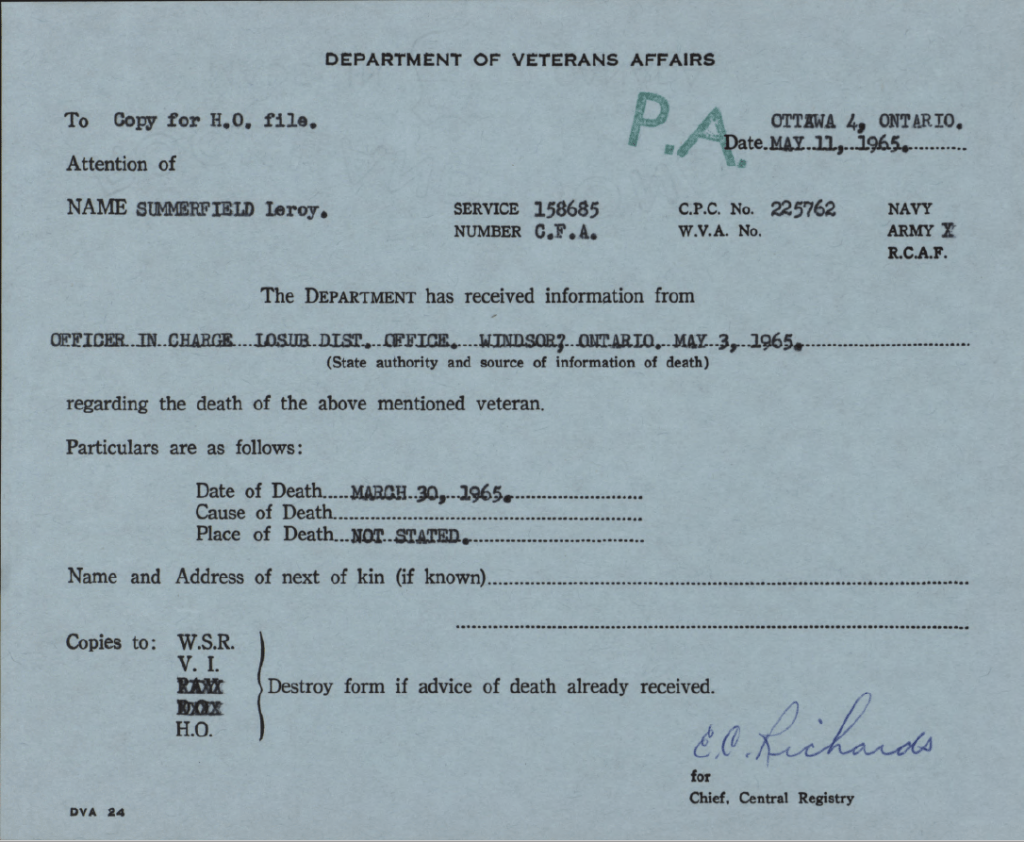 Family Search: LeRoy Summerfield was born on 29 August 1895, in Ontario, Canada as the son of Thomas Summerfield and Matilda Daugherty. He married Dora Pamela Pemberton in 1920, in Halifax, Nova Scotia, Canada. They were the parents of at least 3 sons and 2 daughters. He immigrated to Detroit, Wayne, Michigan, United States in 1945 and lived in Halifax, Nova Scotia, Canada in 1920 and Kingsville, Essex, Ontario, Canada in 1922. He registered for military service in 1915. In 1915, at the age of 20, his occupation is listed as moving picture operator. He died on 30 March 1965, at the age of 69, and was buried in Greenhill Cemetery, Kingsville, Essex, Ontario, Canada.