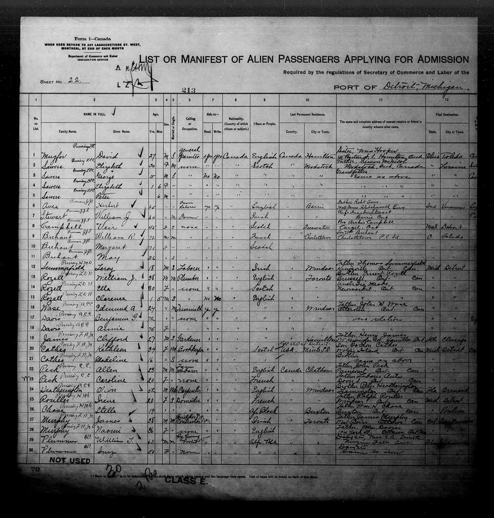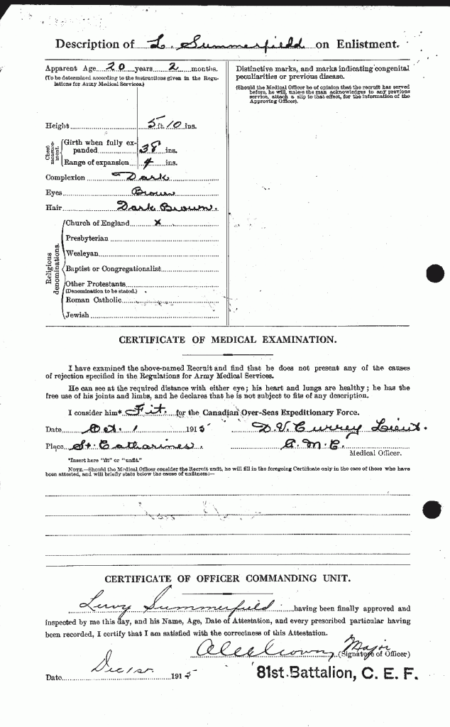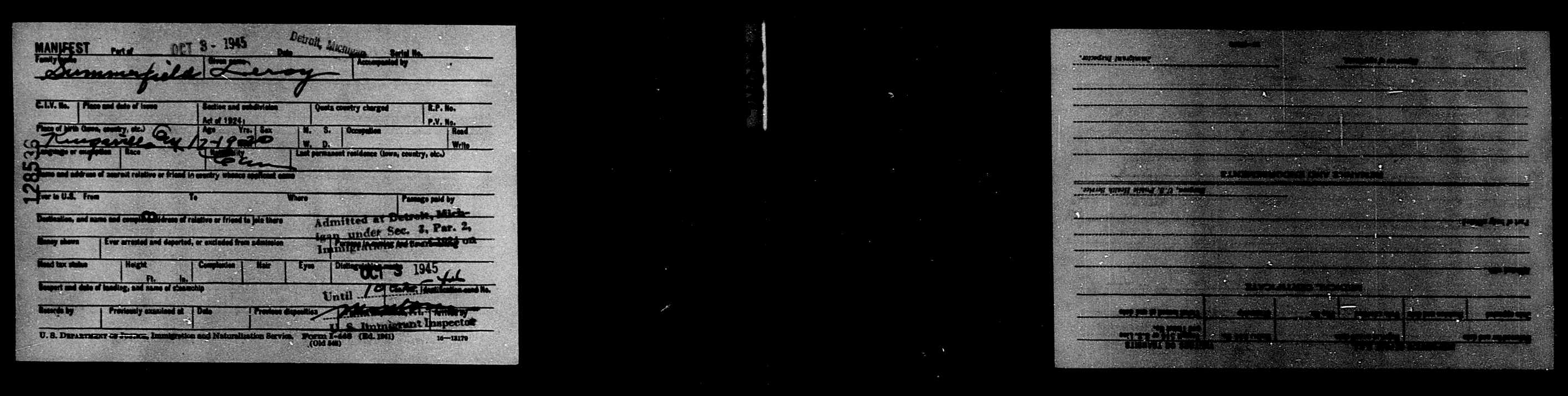 Family Search: LeRoy Summerfield was born on 29 August 1895, in Ontario, Canada as the son of Thomas Summerfield and Matilda Daugherty. He married Dora Pamela Pemberton in 1920, in Halifax, Nova Scotia, Canada. They were the parents of at least 3 sons and 2 daughters. He immigrated to Detroit, Wayne, Michigan, United States in 1945 and lived in Halifax, Nova Scotia, Canada in 1920 and Kingsville, Essex, Ontario, Canada in 1922. He registered for military service in 1915. In 1915, at the age of 20, his occupation is listed as moving picture operator. He died on 30 March 1965, at the age of 69, and was buried in Greenhill Cemetery, Kingsville, Essex, Ontario, Canada.