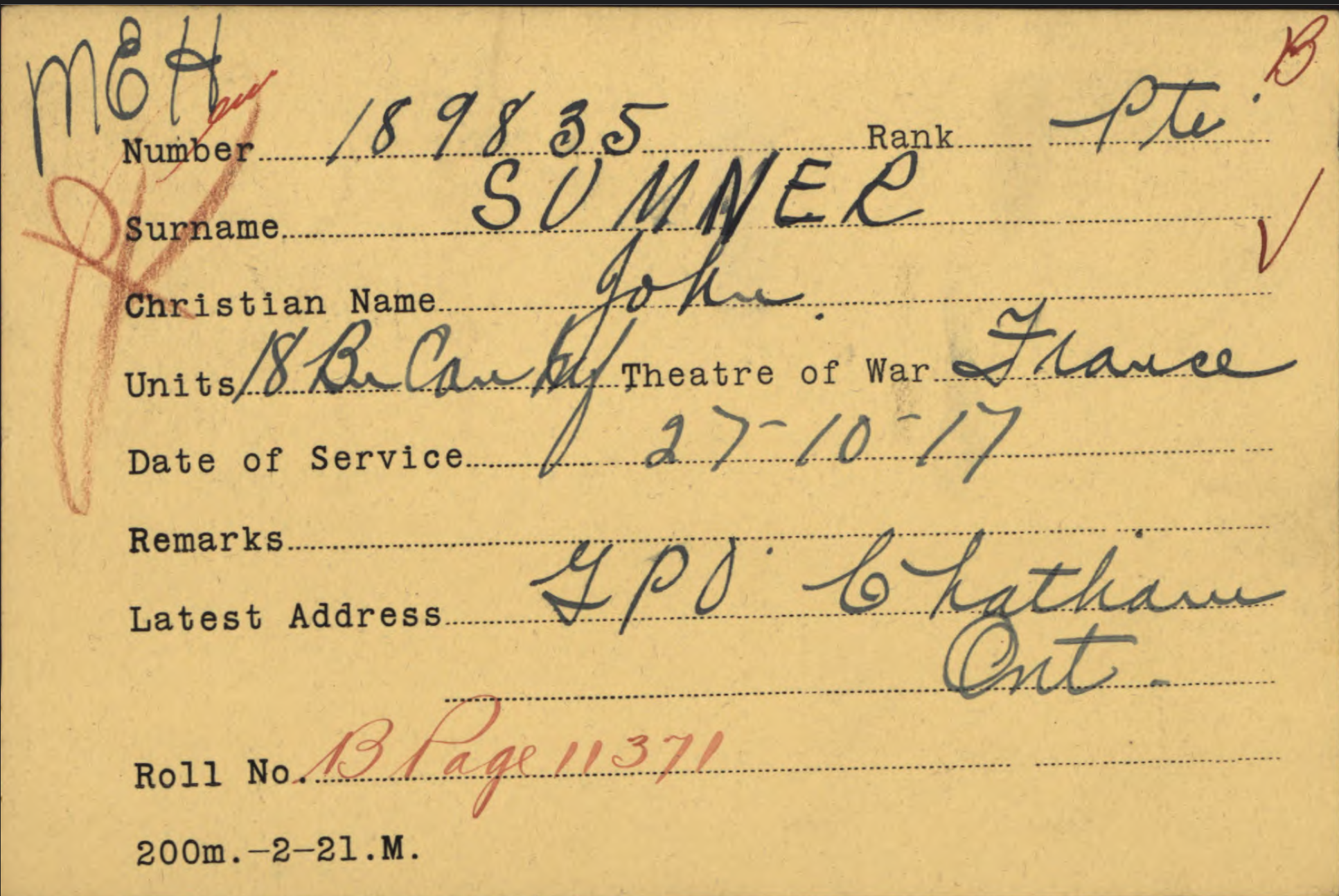 Family Search: Private John Sumner was born on 14 September 1877, in Southport, Lancashire, England, United Kingdom. He immigrated to Canada in 1913 and lived in Chatham, Kent, Ontario, Canada in 1927. He registered for military service in 1916. In 1916, at the age of 39, his occupation is listed as section man, Canadian Pacific Railway in Chatham, Kent, Ontario, Canada. He died on 15 March 1943, in Ontario, Canada, at the age of 65, and was buried in Maple Leaf Cemetery, Chatham, Chatham-Kent, Ontario, Canada.