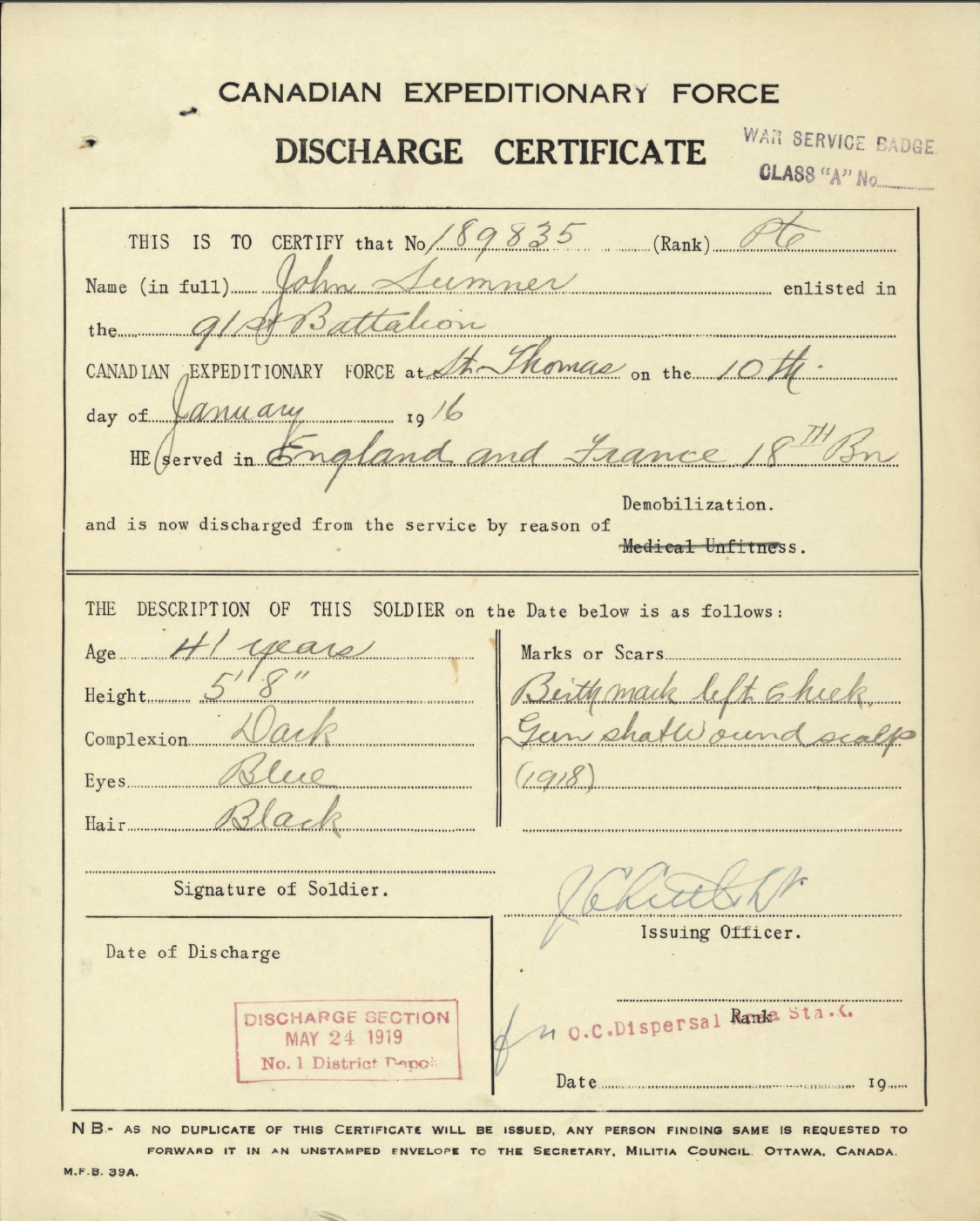 Returning to his Battalion he served the rest of the war with the 18th Battalion and he was discharged due to demobilization on 28 March 1919 at London, Ontario.