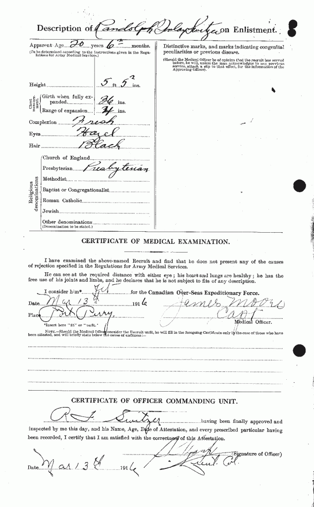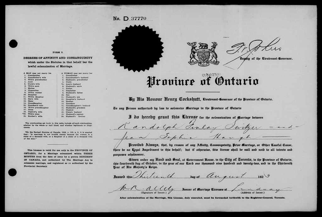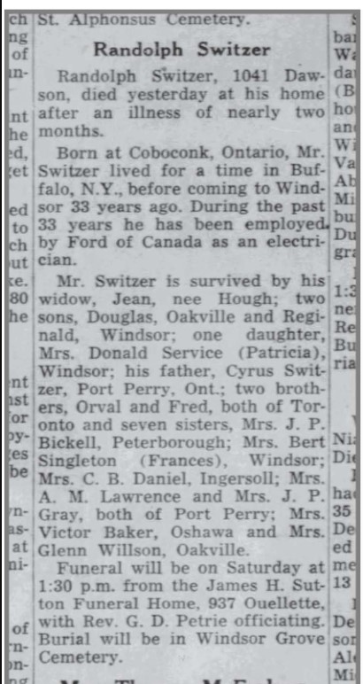 Family Search: When Randolph Finlay Switzer was born on 23 August 1895, in Coboconk, Victoria, Ontario, Canada, his father, Cyrus Warner Switzer, was 23 and his mother, Georgina Frances ‘Teen’ Finlay, was 19. He married Jennie Sophia Haugh on 13 August 1923, in Lindsay, Kawartha Lakes, Ontario, Canada. They were the parents of at least 3 sons and 1 daughter. He immigrated to Buffalo, Erie, New York, United States in 1919 and lived in Port Perry, Durham, Ontario, Canada in 1916 and Buffalo, Erie, New York, United States in 1920. He registered for military service in 1916. In 1916, at the age of 21, his occupation is listed as telephone operator in Port Perry, Durham, Ontario, Canada. He died on 5 May 1955, in Windsor, Essex, Ontario, Canada, at the age of 59, and was buried in Windsor Grove Cemetery, Windsor, Essex, Ontario, Canada.