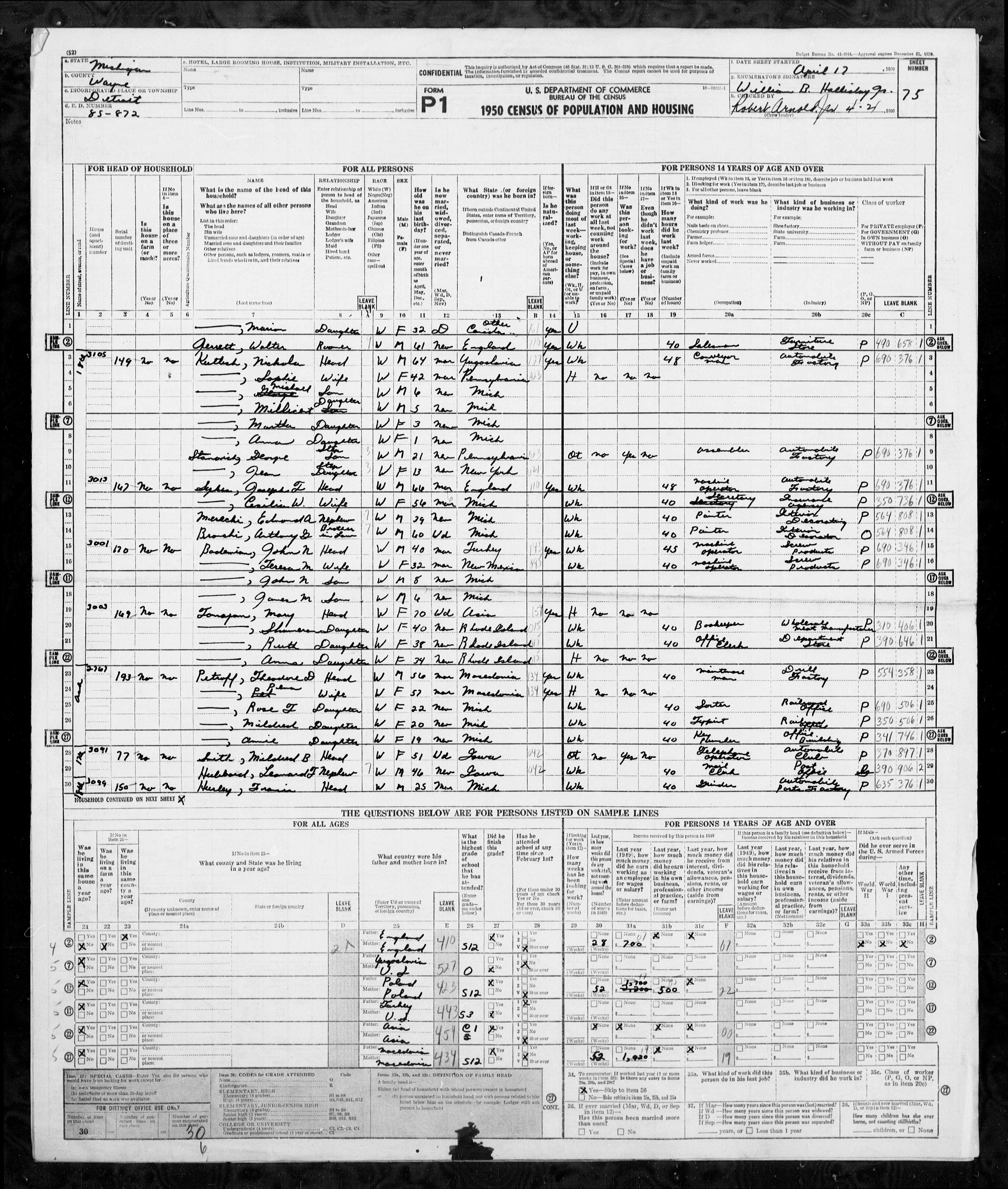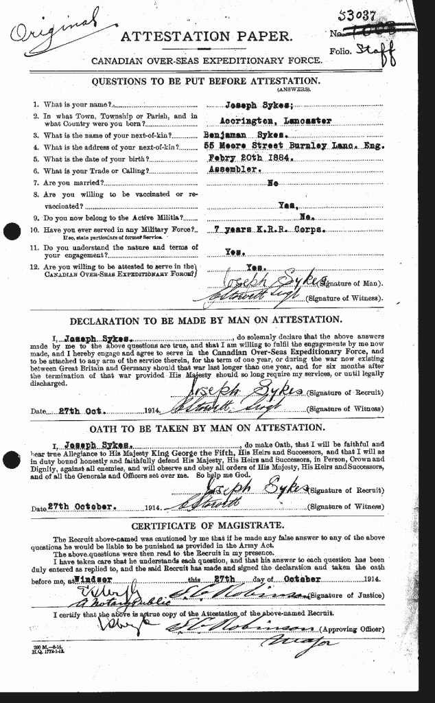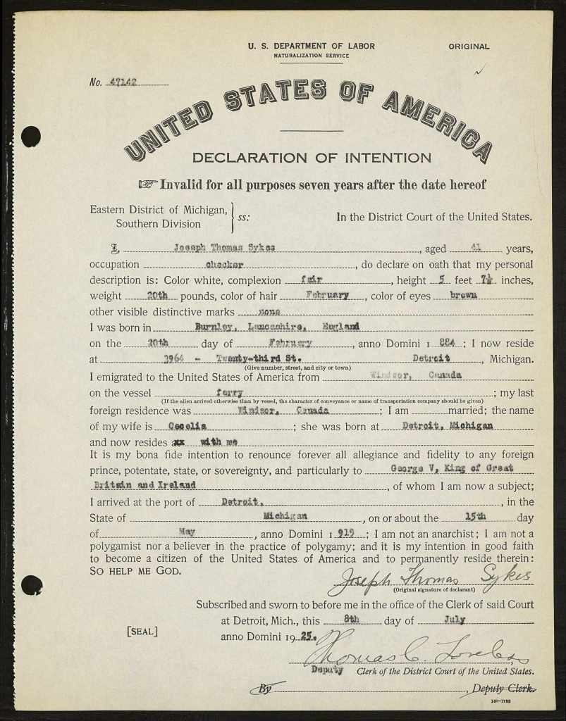 Family Search: Joseph Thomas Sykes was born on 20 February 1884, in Accrington, Lancashire, England, United Kingdom as the son of Benjamin Sykes and Jennina Scantan. He immigrated to United States in 1913 and lived in Detroit, Wayne, Michigan, United States in 1921. He registered for military service in 1914. In 1914, at the age of 30, his occupation is listed as assembler in Detroit, Wayne, Michigan, United States. He died on 20 February 1974, in Michigan, United States, at the age of 90, and was buried in Saint Hedwig Cemetery, Dearborn Heights, Wayne, Michigan, United States.