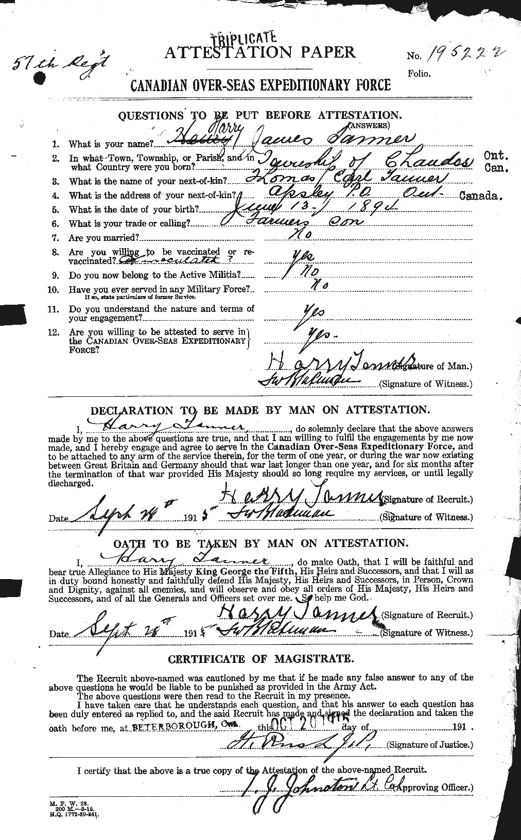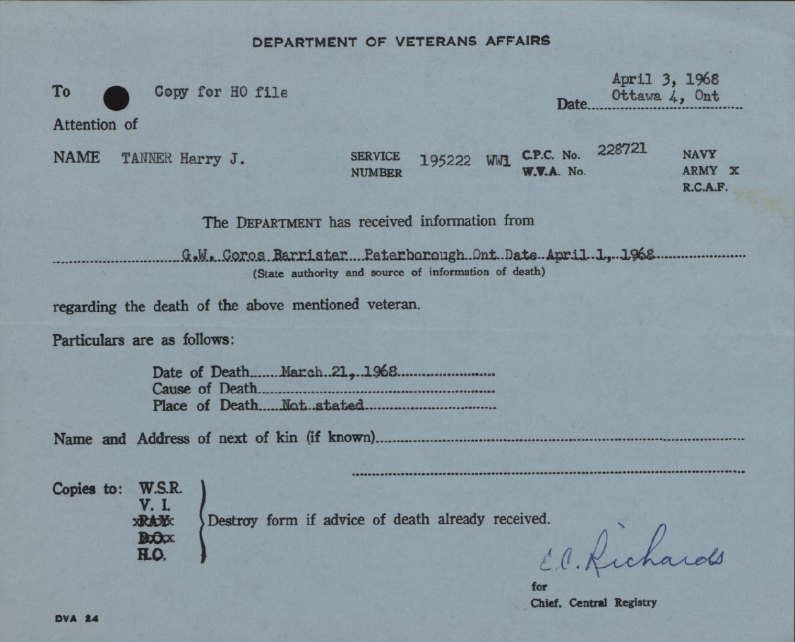 Family Search: When Sergeant Henry James Tanner was born on 13 June 1894, in Chandos Township, Peterborough, Ontario, Canada, his father, Thomas Earl Tanner, was 29 and his mother, Sophia Jane Tanner, was 28. He lived in Peterborough, Peterborough, Ontario, Canada in 1911 and Apsley, Peterborough, Ontario, Canada in 1922. He registered for military service in 1915. In 1915, at the age of 21, his occupation is listed as farmer in Chandos Township, Peterborough, Ontario, Canada. He died on 21 March 1968, at the age of 73, and was buried in Apsley, Peterborough, Ontario, Canada.
