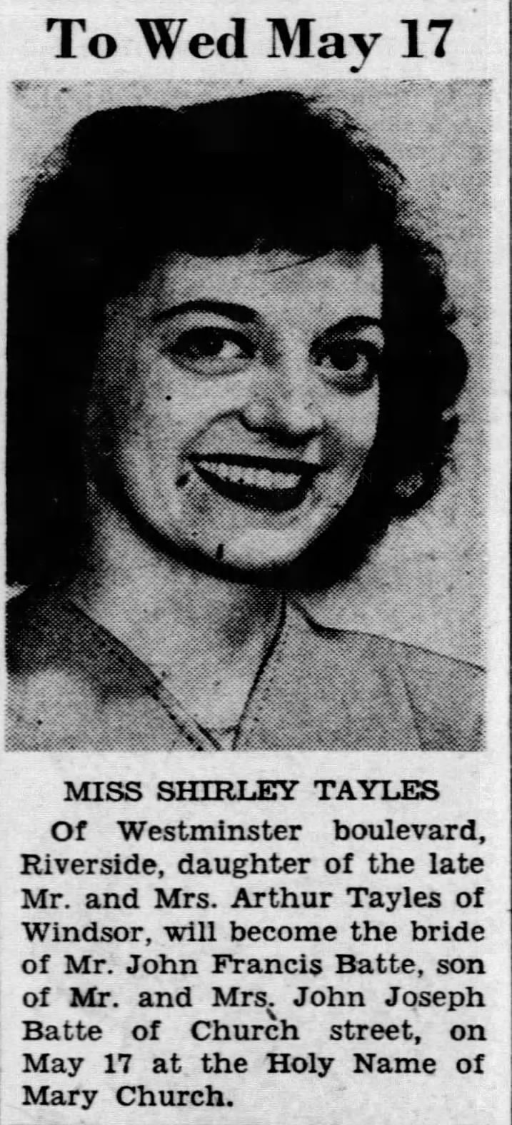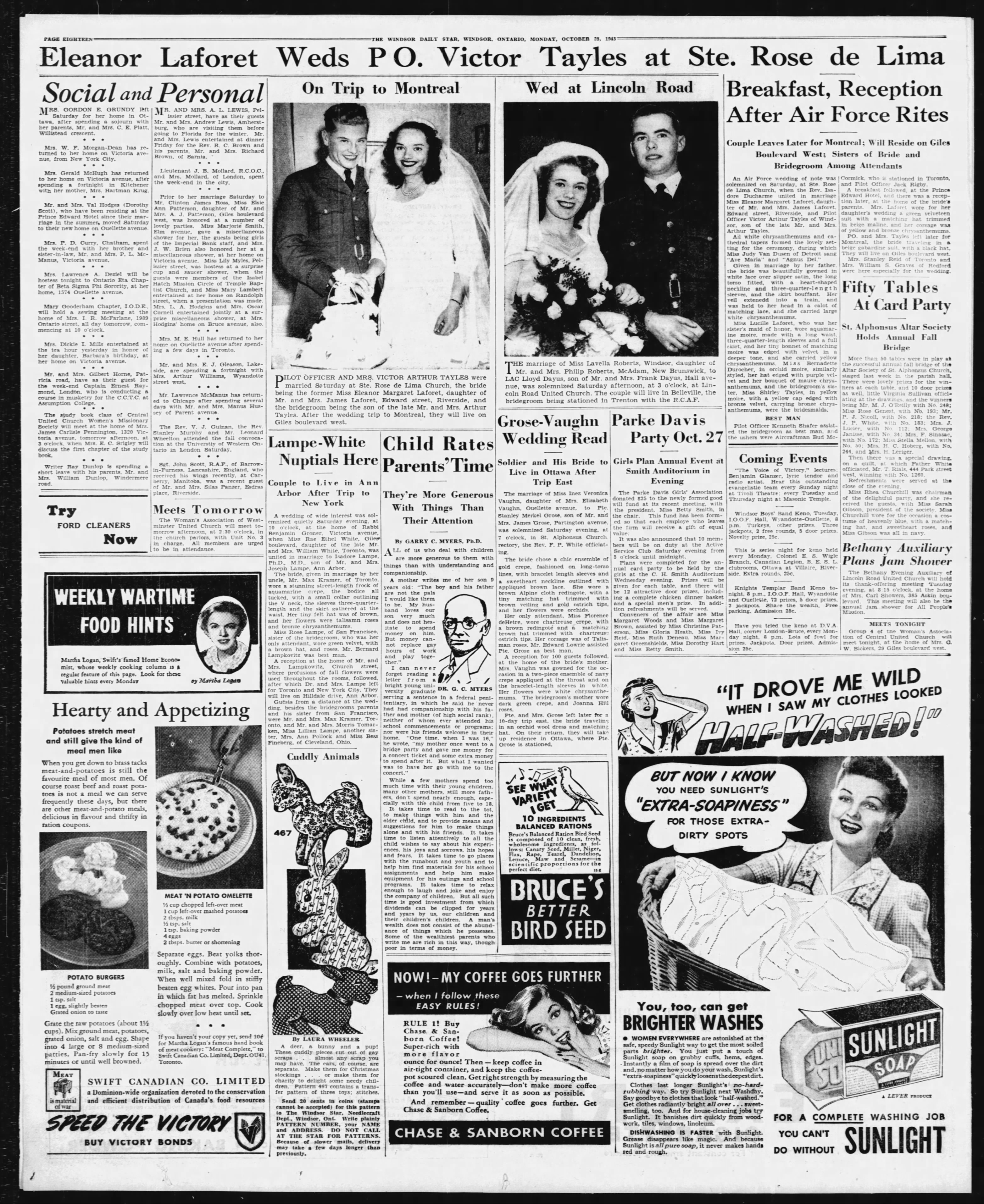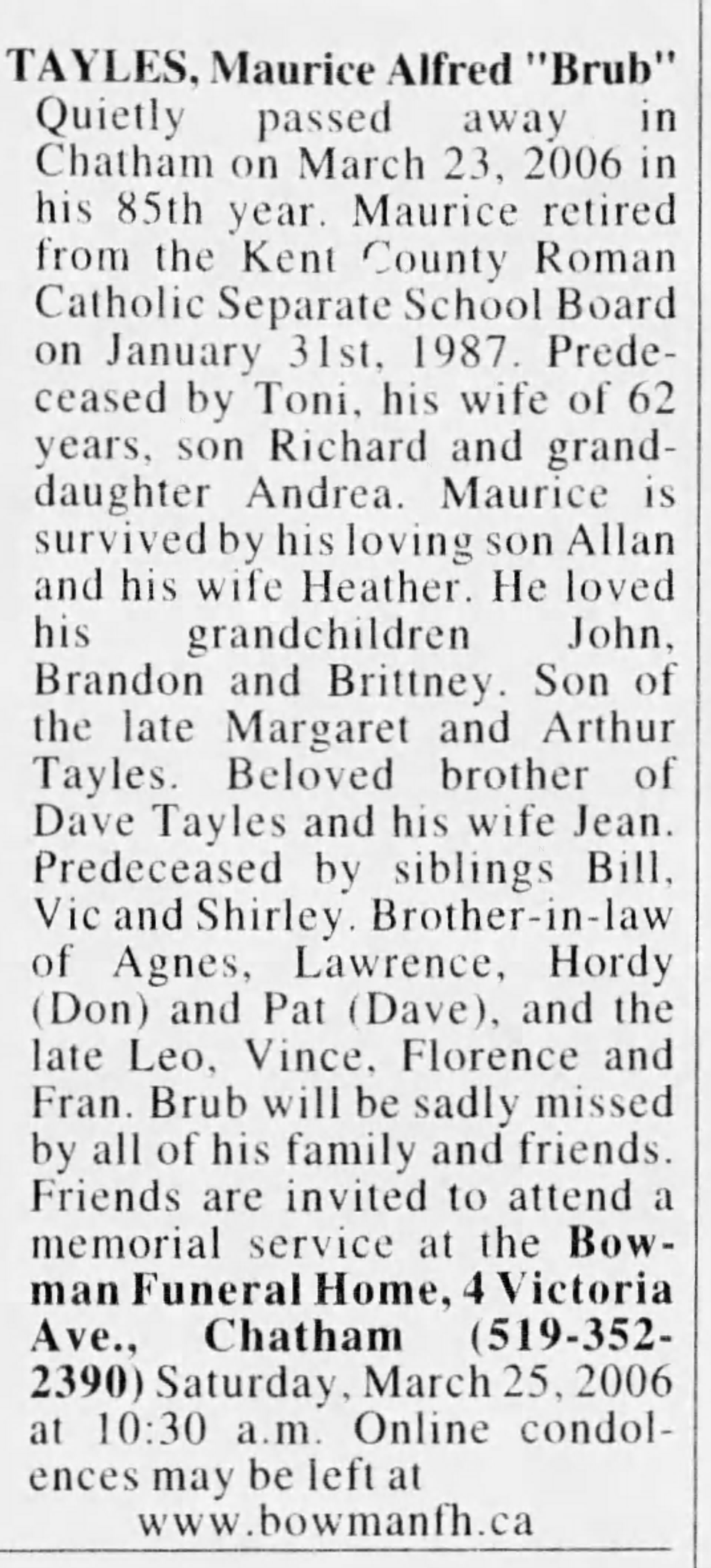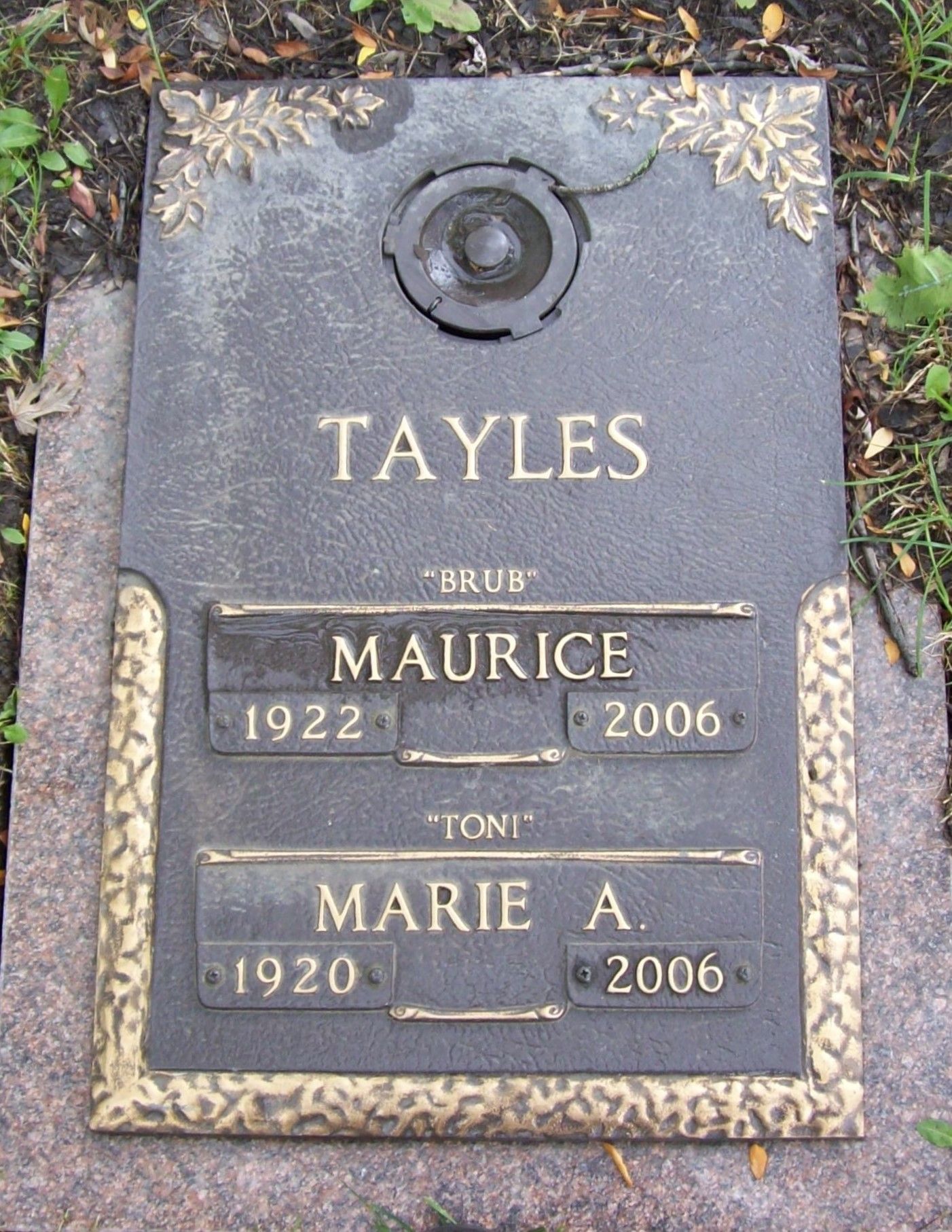 Family Search: When Sergeant Arthur Tayles was born on 13 June 1892, in Welby, Leicestershire, England, United Kingdom, his father, William Taylor, was 29 and his mother, Louisa Wood, was 27. He married Maggie Madeline Hilda Whatford on 21 June 1919, in Chatham, Kent, Ontario, Canada. They were the parents of at least 4 sons and 2 daughters. He immigrated to Canada in 1913 and lived in Chatham, Kent, Ontario, Canada in 1921 and Windsor, Sandwich, Essex, Ontario, Canada in 1923. He registered for military service in 1915. In 1915, at the age of 23, his occupation is listed as farmer in Dover, Kent, Ontario, Canada. He died on 27 October 1940, in Windsor, Essex, Ontario, Canada, at the age of 48, and was buried in Windsor Grove Cemetery, Windsor, Essex, Ontario, Canada.