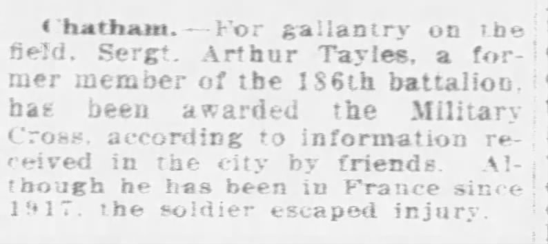 5/08/1919 – Sgt. Arthur Tayles reported to have risen to the rank of Sargent and had been awarded the Military Medal (ref: LG 31430 dl. / 3.7.19). His scar on the left thigh was from an accident – Pre-war. He was Discharged 24/05/1919 at London, ON. “Demobilization” then living at 15 Edgar St., Chatham, ON.