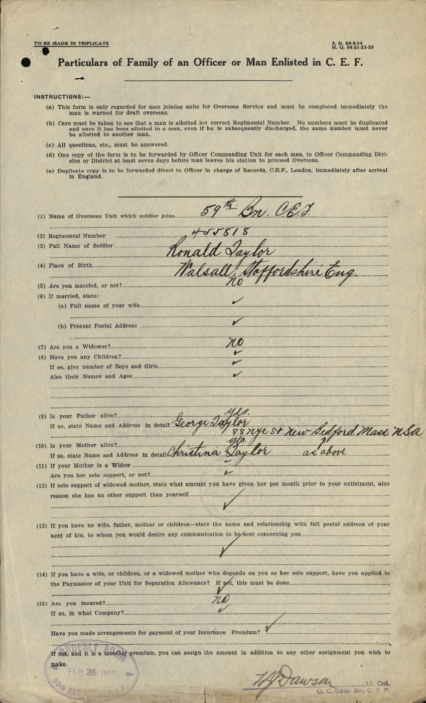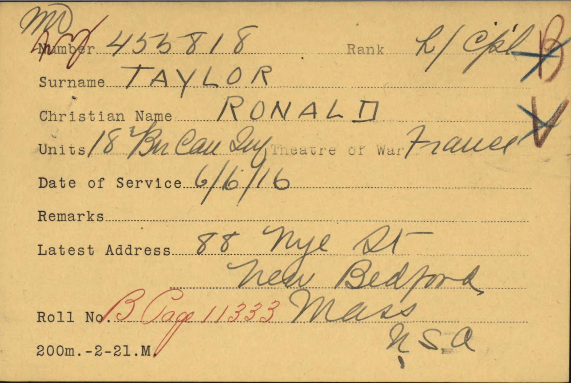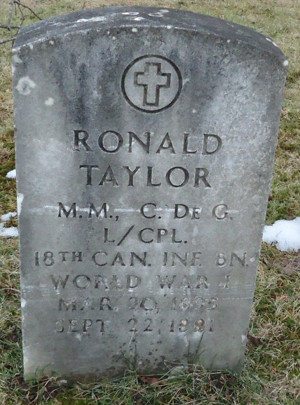 Family Search: When Lance-Corporal Ronald Taylor was born on 20 March 1895, in Walsall, Staffordshire, England, United Kingdom, his father, George Taylor, was 32 and his mother, Christina Cleghorn, was 31. He married Etta Perrin on 26 June 1924, in New Bedford, Bristol, Massachusetts, United States. He lived in Bedford, Middlesex, Massachusetts, United States in 1922 and New Bedford, Bristol, Massachusetts, United States for about 10 years. He died on 22 September 1981, in Bristol, Massachusetts, United States, at the age of 86, and was buried in New Bedford, Bristol, Massachusetts, United States