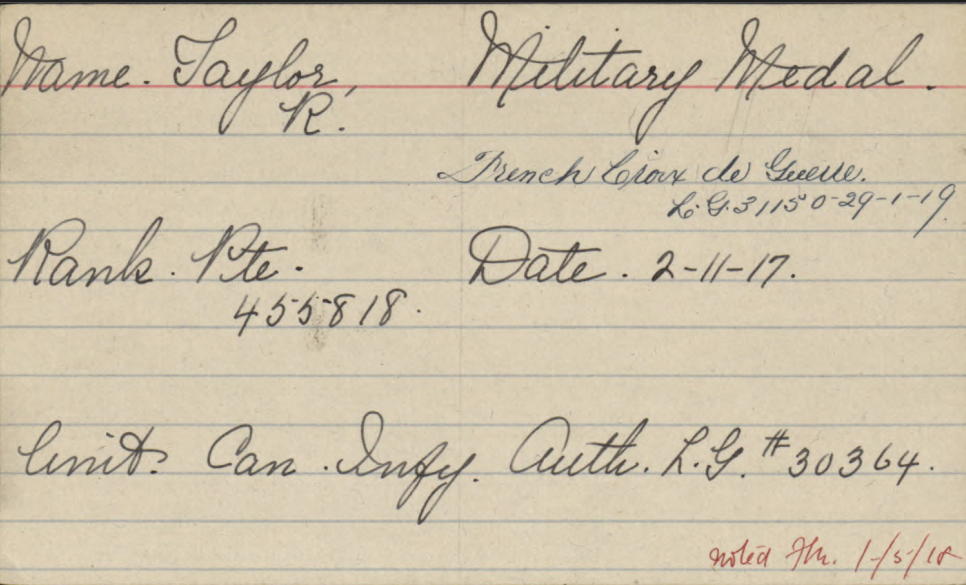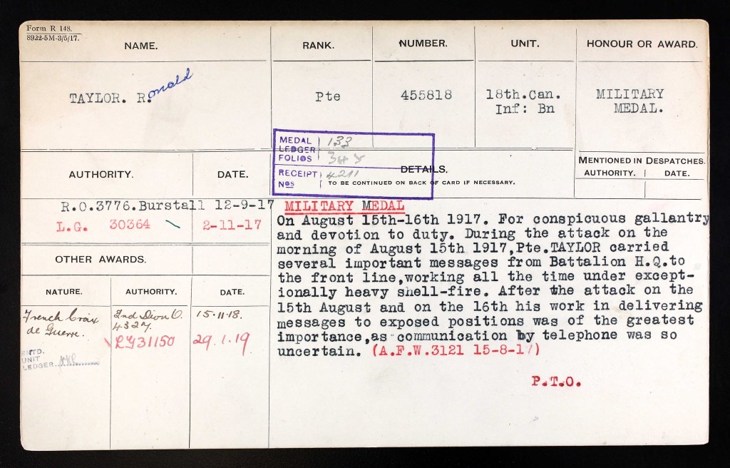 “On August 15th-16th 1917. For conspicuous gallantry and devotion to duty. During the attack on the morning of August 15th 1917, Pte. TAYLOR carried several important messages from Battalion H.Q. to the front line, working all the time under exceptionally heavy shell-fire. After the attack on the 15th August and on the 16th his work in delivering messages to exposed positions was of the greatest importance, as communication by telephone was so uncertain. (A.F.W.3121 15-8-17)”