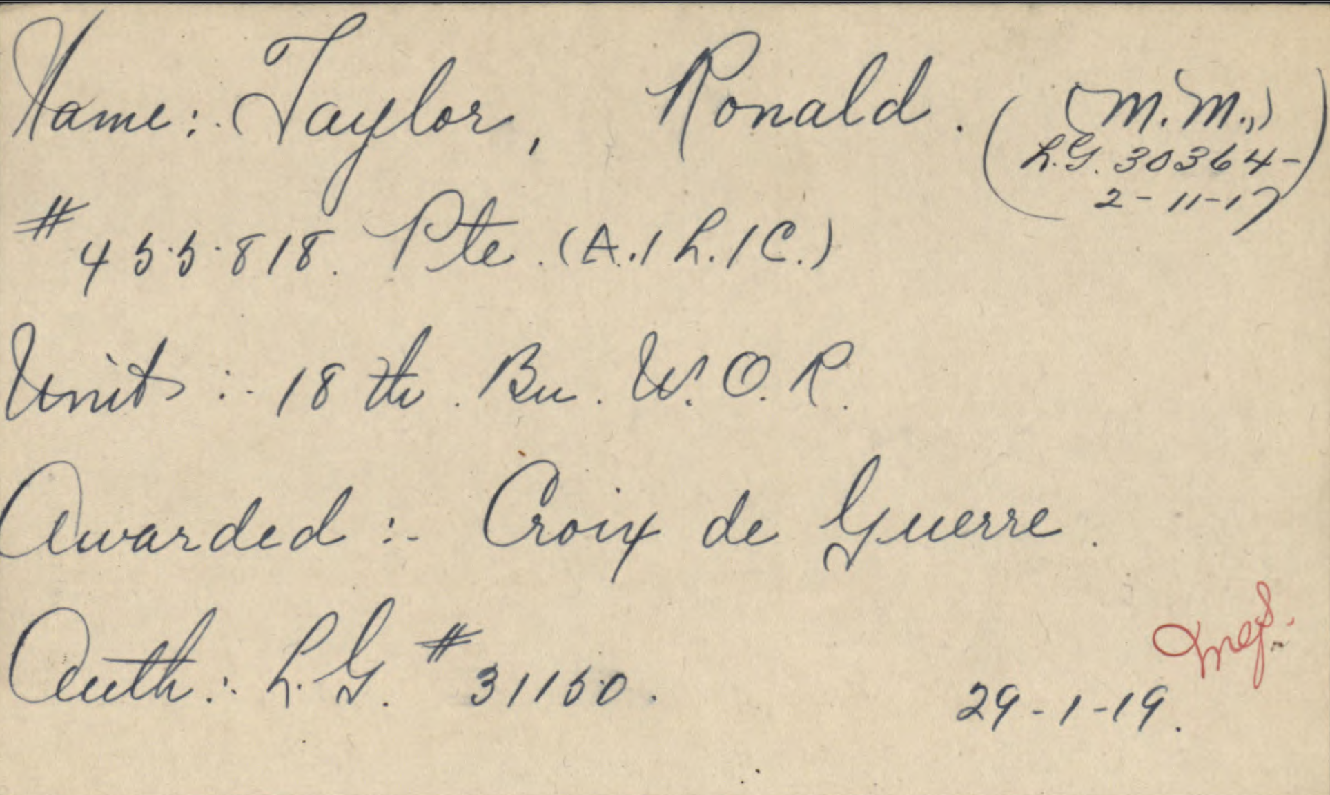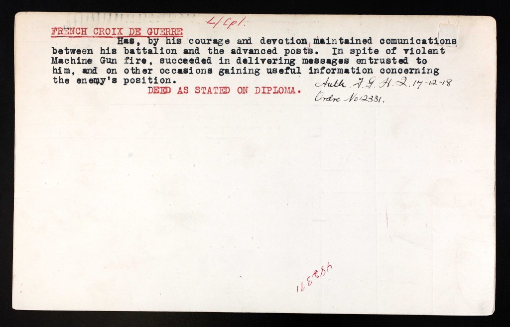 He was awarded the French Coix De Guerre at Rouen, France on 29 January 1919.