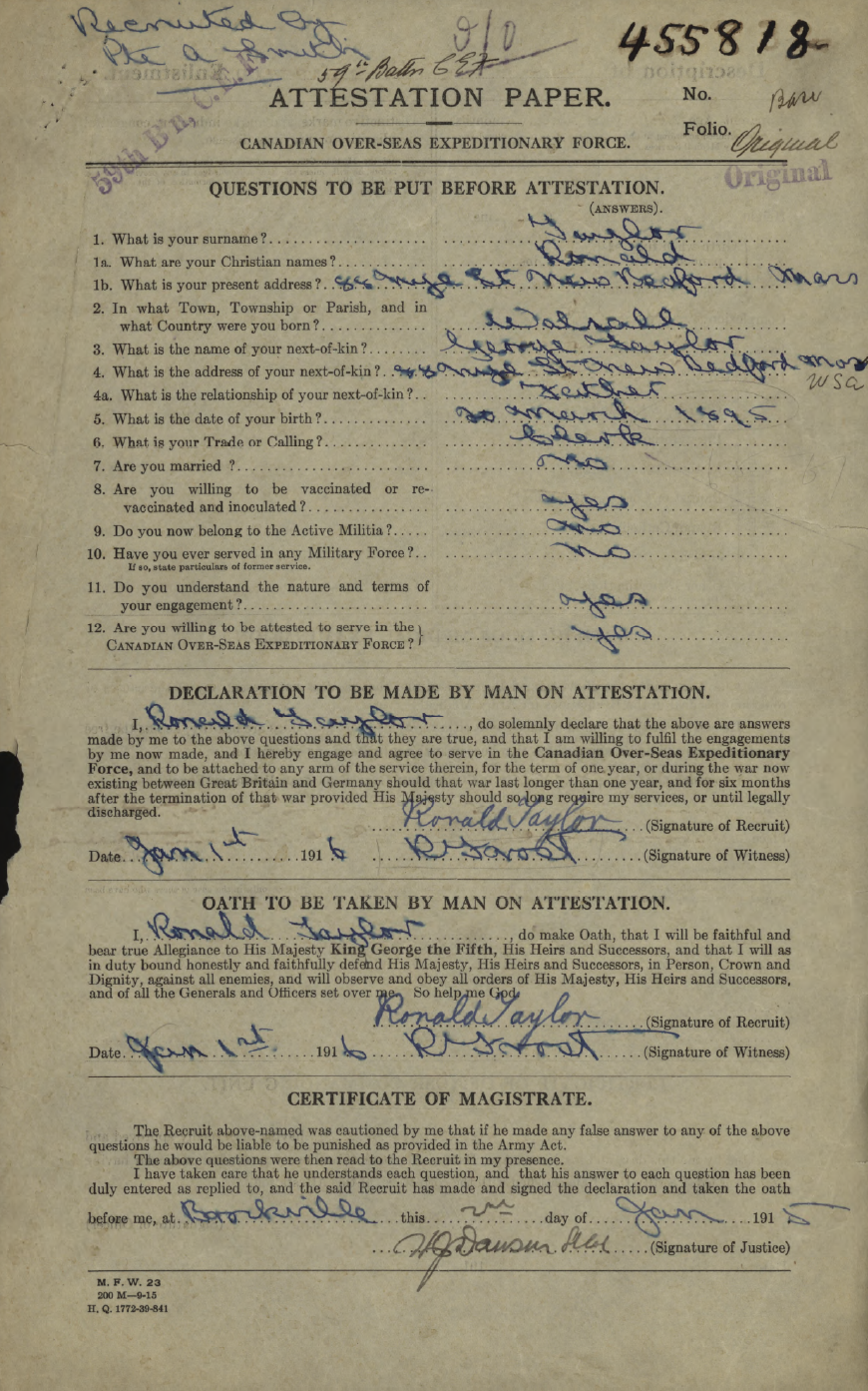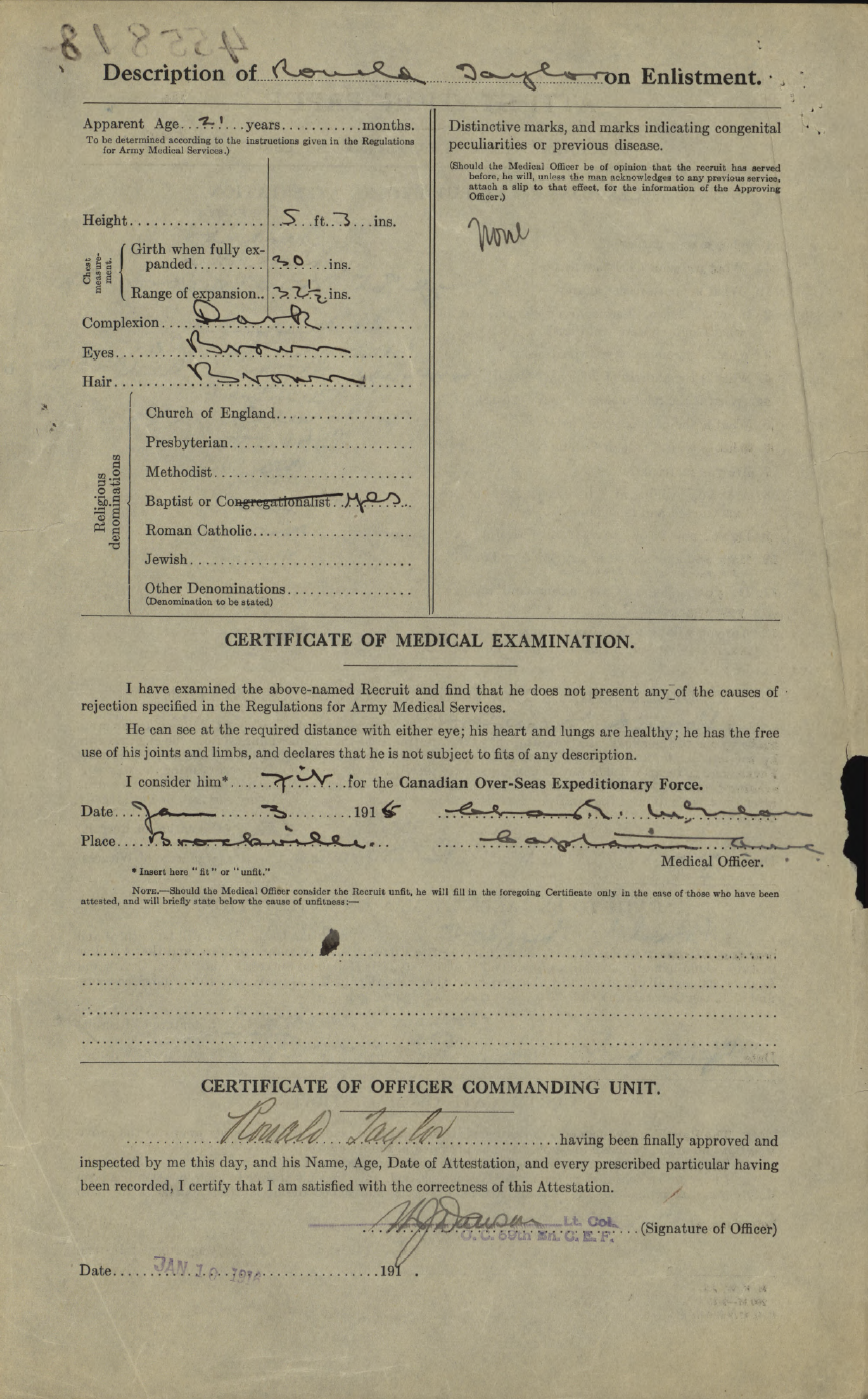 This man was enlisted with the 59th Battalion CEF at Brockville, Ontario on 11 January 1916.