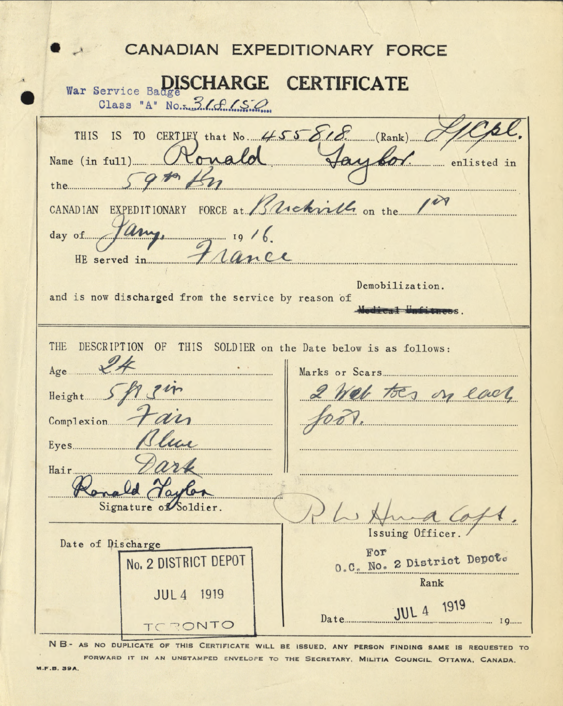 He was discharged due to demobilization at Toronto, Ontario on 4 July 1919.