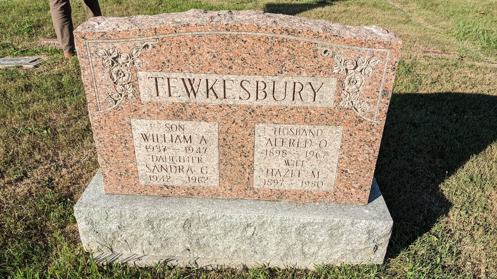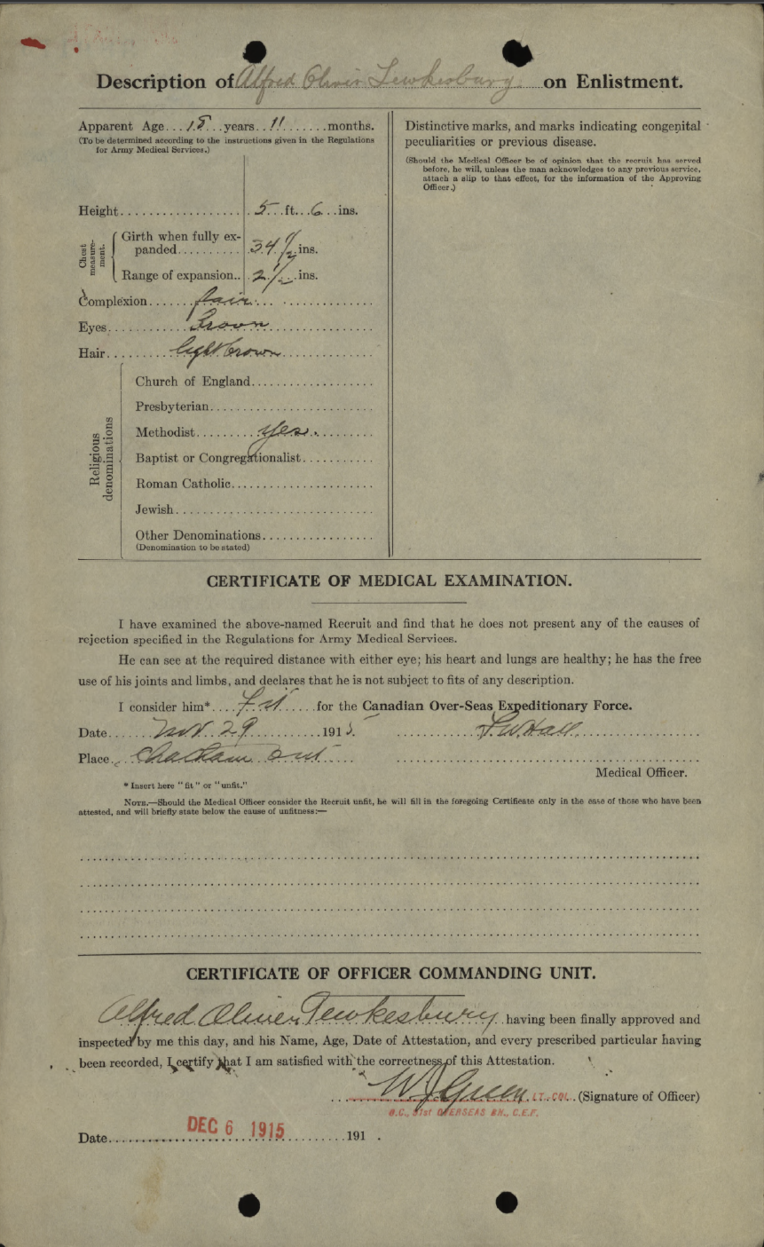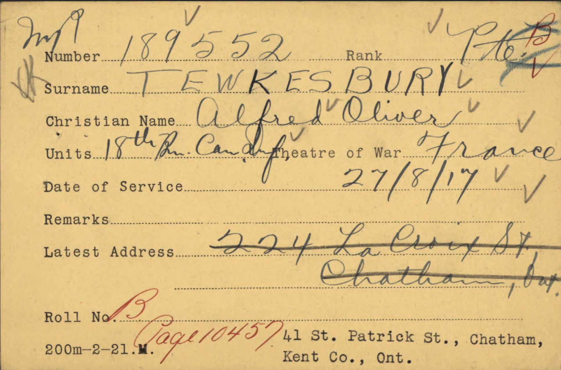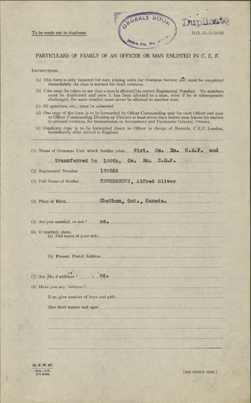 Family Search: When Private Alfred Oliver Tewkesbury was born on 12 January 1898, in Chatham, Kent, Ontario, Canada, his father, John Thomas Tewkesbury, was 35 and his mother, Mary Anne Lecocq, was 34. He married Minnie Mildred Pickering on 21 October 1919, in Chatham, Kent, Ontario, Canada. They were the parents of at least 1 son. He lived in Kent, Ontario, Canada for about 10 years. He registered for military service in 1916. In 1945, his occupation is listed as owner, chatham sand and gravel in Chatham, Kent, Ontario, Canada. He died on 24 August 1967, in Chatham, Kent, Ontario, Canada, at the age of 69, and was buried in Maple Leaf Cemetery, Chatham, Chatham-Kent, Ontario, Canada.