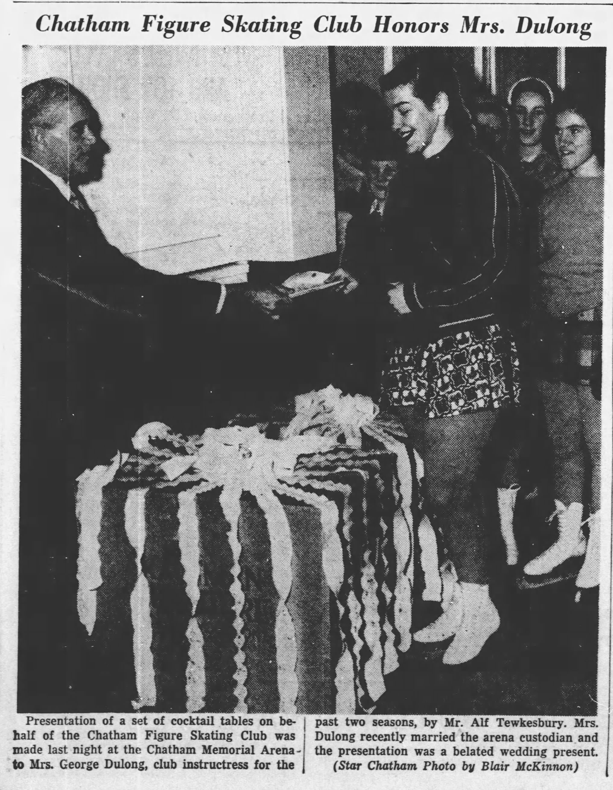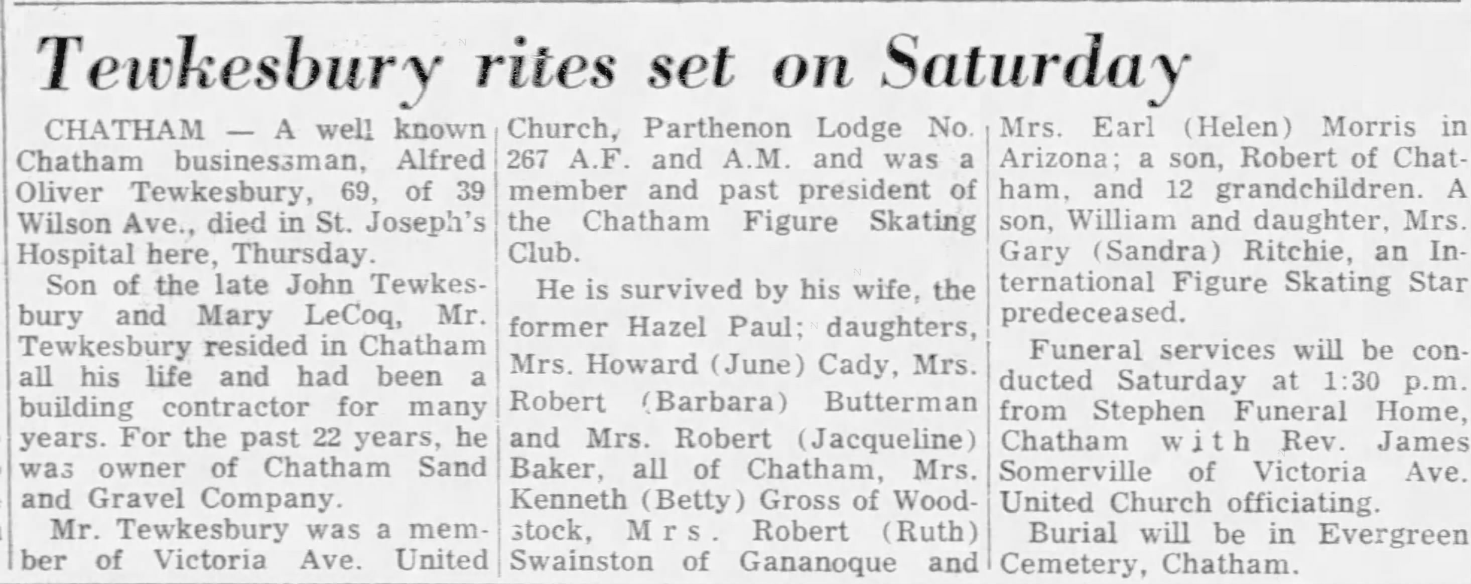 Mr. Tewkesbury was a member of Victoria Ave. United Church, Parthenon Lodge No. 267 A.F. and A.M. and was a member and past president of the Chatham Figure Skating Club.