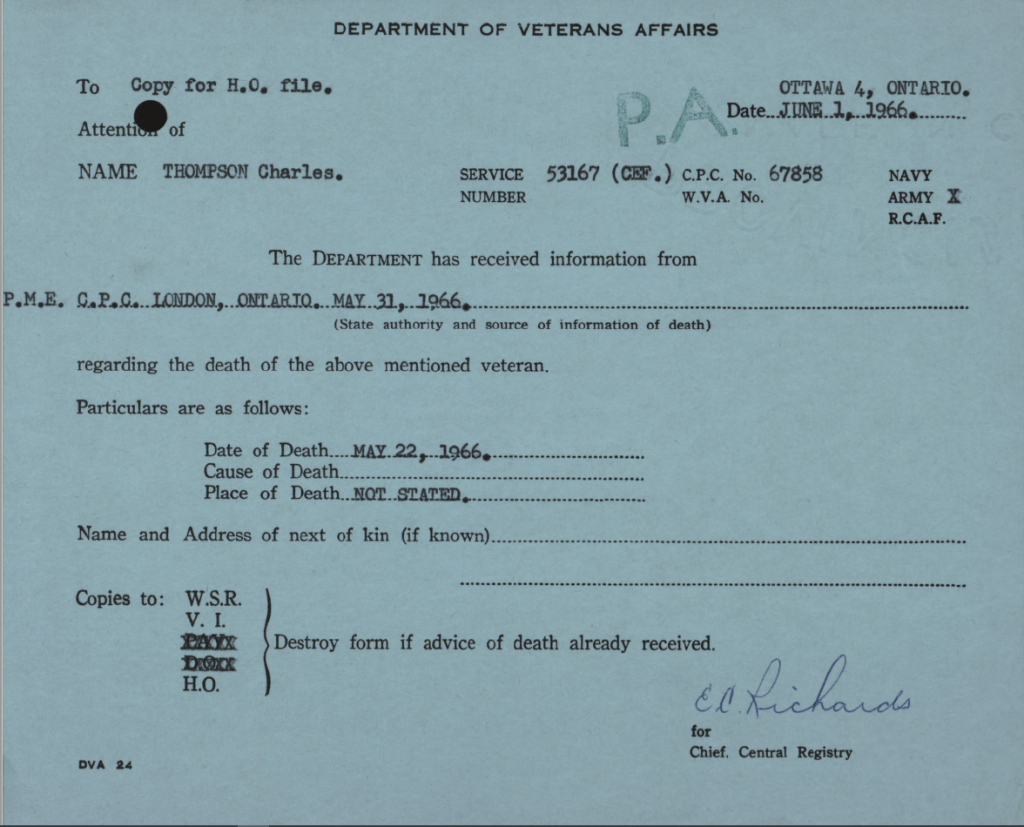 Family Search: Charles Henry Thompson was born on 17 December 1888, in England, United Kingdom as the son of Charles Thompson and Susan Helling. He married Lucy Lanning Barter on 10 April 1912, in York, Ontario, Canada. He immigrated to Canada in 1913 and lived in Fordwich, Howick, Huron, Ontario, Canada in 1914 and Harriston, Minto, Wellington, Ontario, Canada in 1921. He registered for military service in 1914. In 1914, at the age of 26, his occupation is listed as section foreman. He died on 22 May 1966, at the age of 77, and was buried in Brampton Cemetery, Brampton, Peel, Ontario, Canada.