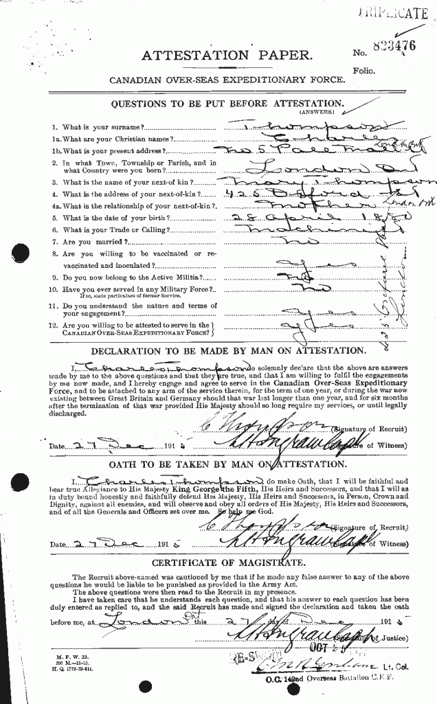Family Search: Private Charles Thompson was born on 28 April 1880, in London, Ontario, Canada. He registered for military service in 1915. In 1915, at the age of 35, his occupation is listed as machinist. He died on 20 May 1943, in London, Ontario, Canada, at the age of 63, and was buried in Woodland Cemetery, London, Ontario, Canada.