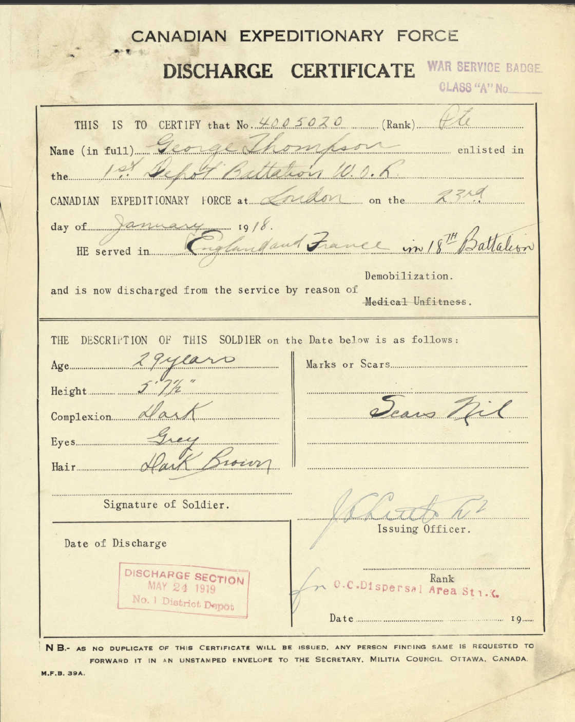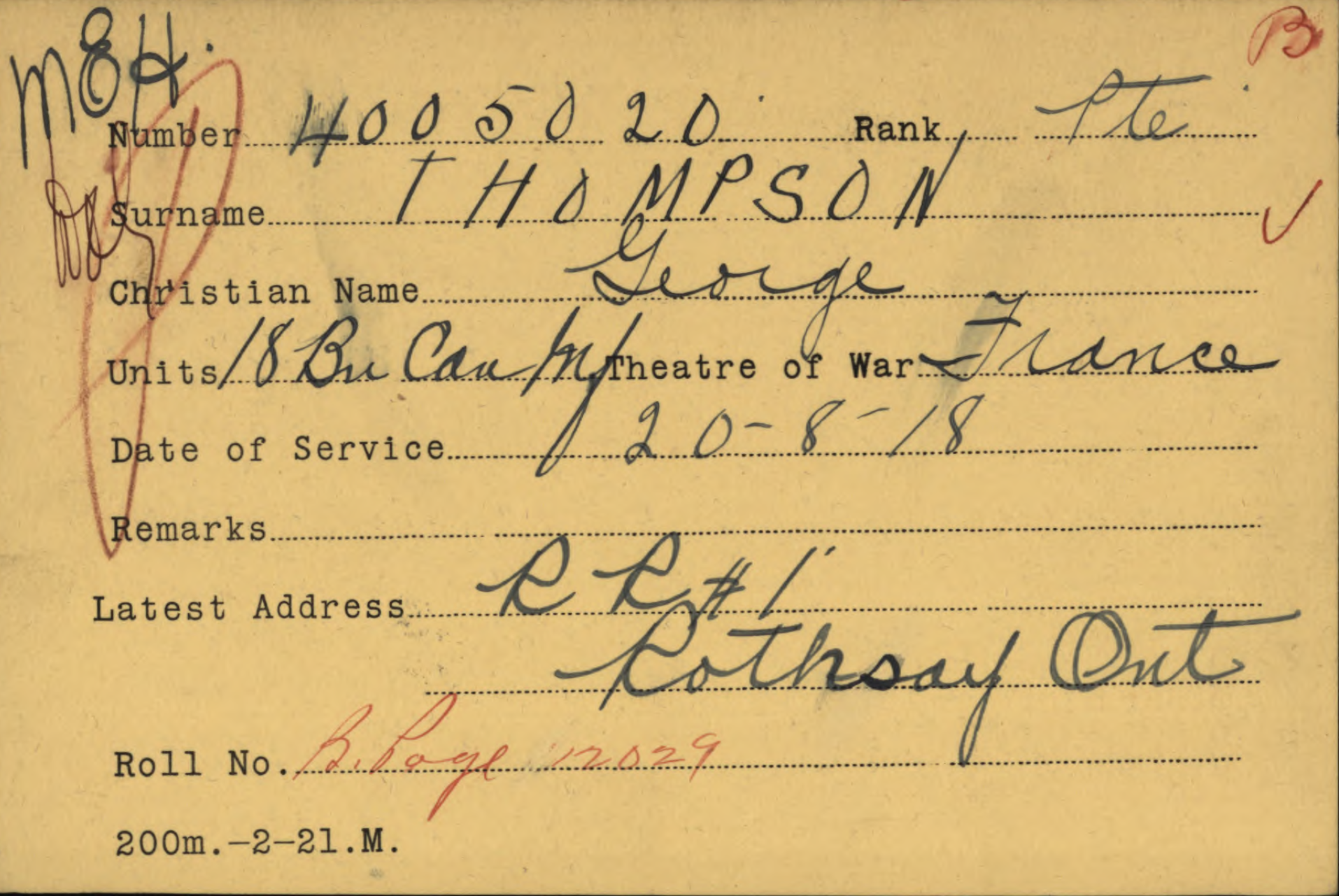 Family Search: Private George Thompson was born on 28 January 1891, in Maryborough Township, Wellington, Ontario, Canada as the son of William Thompson and Elizabeth. He lived in Rothsay, Wellington, Ontario, Canada for about 8 years. He registered for military service in 1918. In 1918, at the age of 27, his occupation is listed as farmer in Rothsay, Wellington, Ontario, Canada.