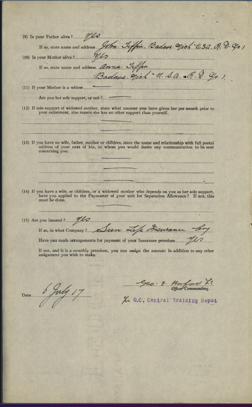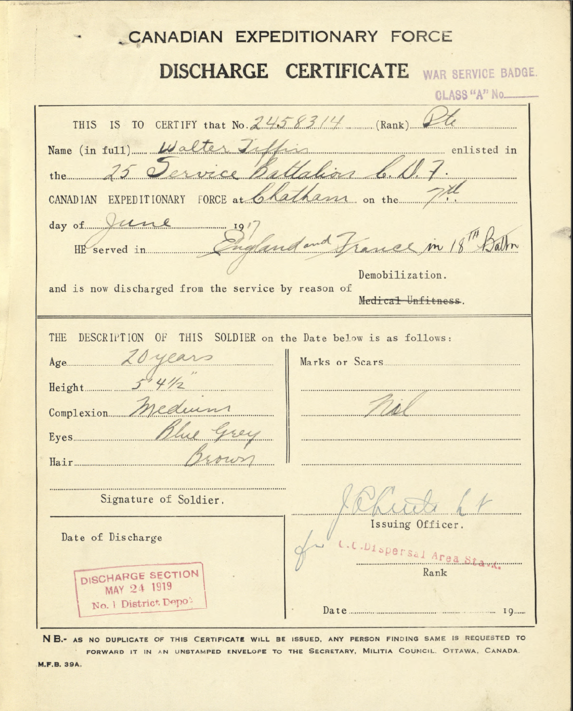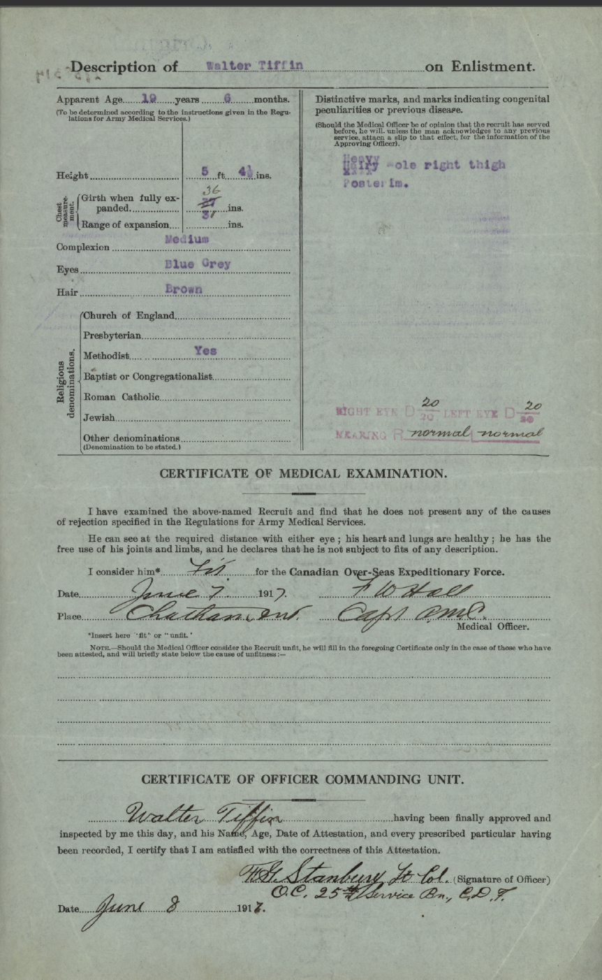 Family Search: When Private Walter G. Tiffin was born on 9 December 1898, in Bad Axe, Huron, Michigan, United States, his father, John Tiffin, was 44 and his mother, Etta Gourley, was 37. He had at least 1 son with Vera J Tiffin. He lived in Detroit, Wayne, Michigan, United States in 1930 and Redford Township, Wayne, Michigan, United States in 1940. He registered for military service in 1917. In 1917, at the age of 19, his occupation is listed as mechanic in Dresden, Kent, Ontario, Canada. He died on 30 January 1953, at the age of 54.