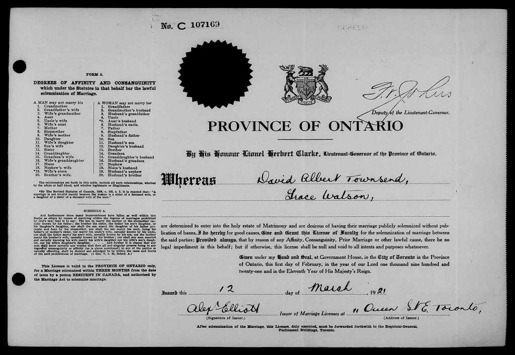 Family Search: When David Albert Townsend Jr. was born on 10 March 1896, in Stratford, Perth, Ontario, Canada, his father, David Albert Townsend, was 33 and his mother, Alvinia Bertha Peick, was 31. He married Laura Grace Watson on 12 March 1921, in Aurora, York, Upper Canada, British Colonial America. He lived in Perth, Ontario, Canada in 1911 and Toronto, York, Ontario, Canada in 1945. He registered for military service in 1914. In 1914, at the age of 18, his occupation is listed as plumber in Stratford, Perth, Ontario, Canada. He died in June 1954, at the age of 58, and was buried in Mount Pleasant Cemetery, Toronto, York, Ontario, Canada.