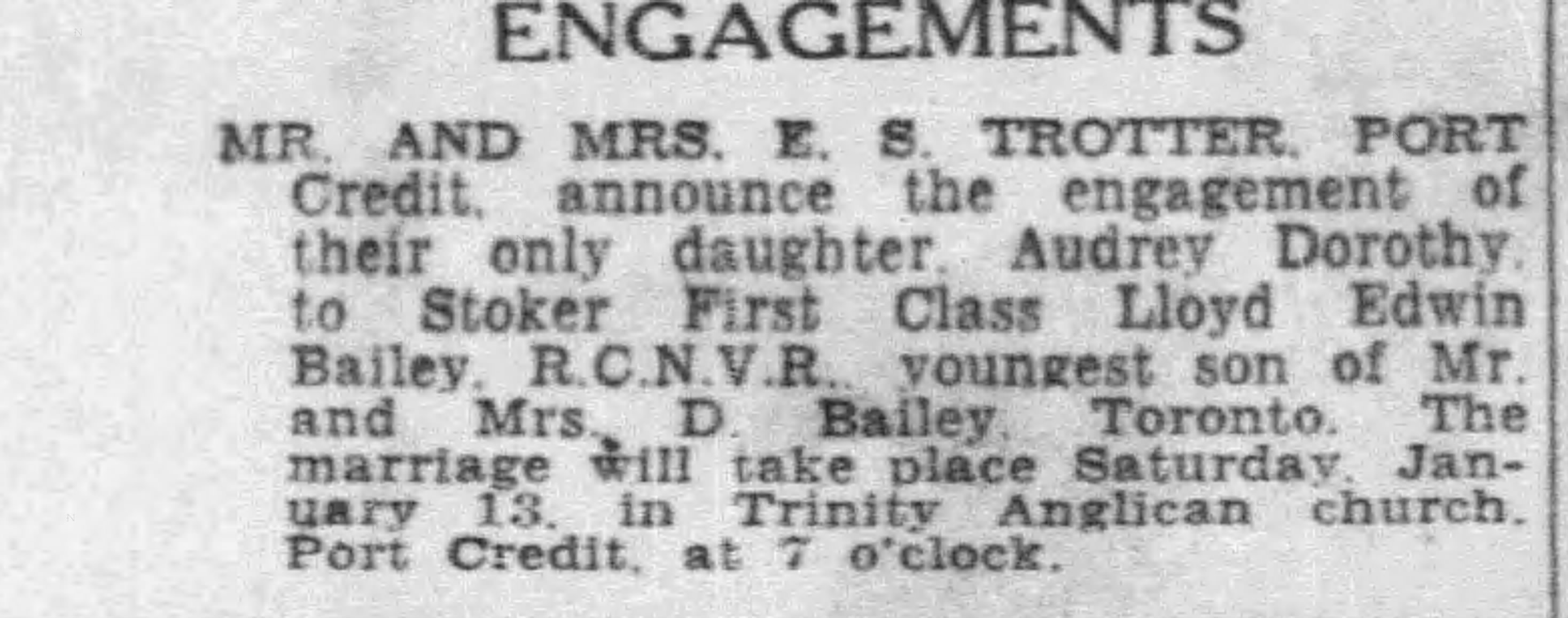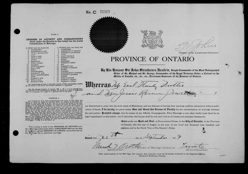 Family Search: When Corporal Errol Stanley Trotter was born on 1 September 1893, in Port Credit, Mississauga, Peel, Ontario, Canada, his father, William Henry Trotter, was 54 and his mother, Frances Caroline Evans, was 39. He married Jessica Rosina Powell on 26 September 1919, in Toronto, Ontario, Canada. They were the parents of at least 1 son and 1 daughter. He lived in Peel Township, Wellington, Ontario, Canada in 1911 and Port Credit, Peel, Canada West, British North America in 1931. He registered for military service in 1915. In 1931, at the age of 38, his occupation is listed as truck driver in Port Credit, Toronto Township, Peel, Ontario, Canada.