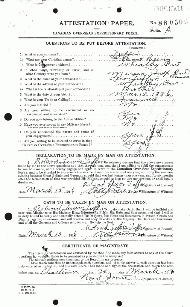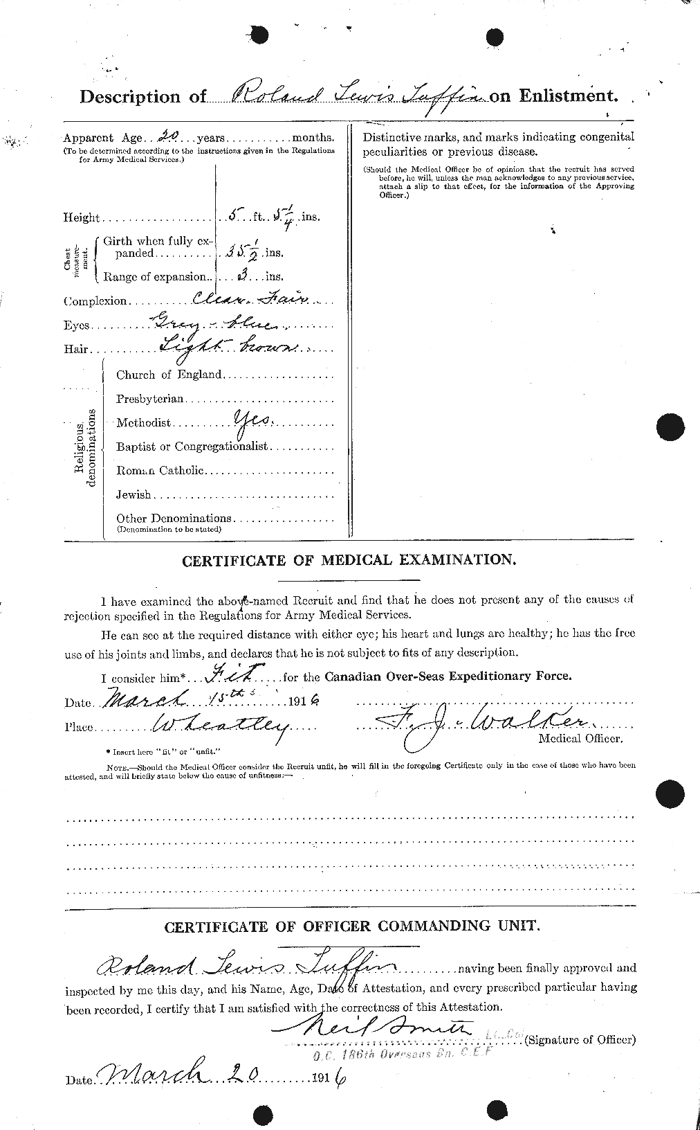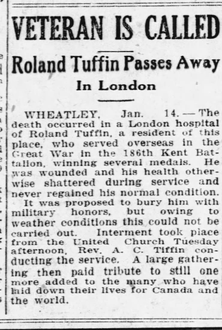 Family Search: Corporal Roland Lewis Tuffin was born on 12 March 1896, in Hibbert Township, Perth, Ontario, Canada as the son of John E. Tuffin and Elizabeth Jane Reid. He lived in Staffa, West Perth, Perth, Ontario, Canada in 1919 and Blytheswood, Leamington, Essex, Ontario, Canada in 1922. He registered for military service in 1916. In 1916, at the age of 20, his occupation is listed as farmer in Wheatley, Chatham-Kent, Ontario, Canada. He died on 9 January 1926, in London, Ontario, Canada, at the age of 29, and was buried in Fairview Cemetery, Wheatley, Chatham-Kent, Ontario, Canada.MORE