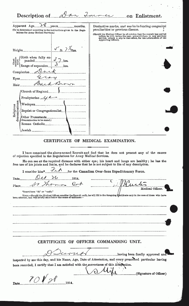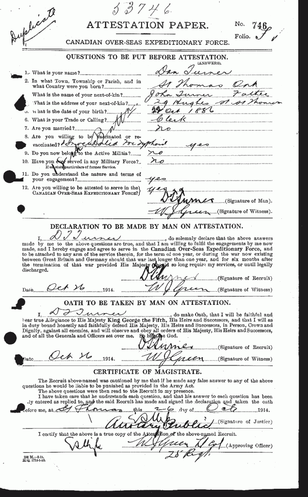 Family Search: When Daniel Thompson Turner was born on 22 October 1886, in St. Thomas, Elgin, Ontario, Canada, his father, John T Turner, was 31 and his mother, Flora Thomson, was 28. He lived in Elgin, Ontario, Canada in 1901. He registered for military service in 1914. In 1914, at the age of 28, his occupation is listed as clerk. He died on 13 February 1949, at the age of 62, and was buried in St. Thomas Cemetery, St. Thomas, Elgin, Ontario, Canada.