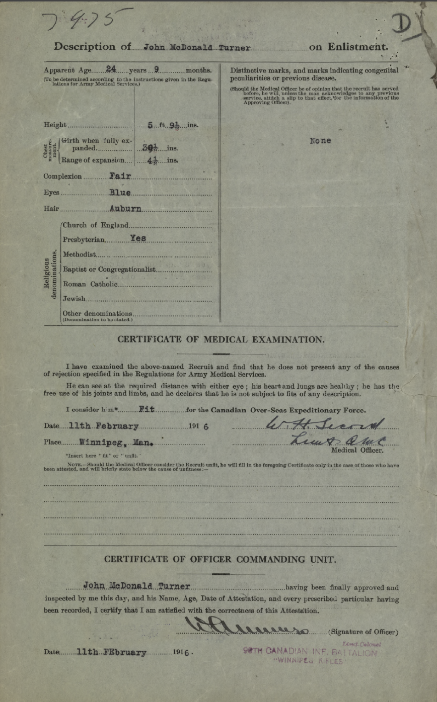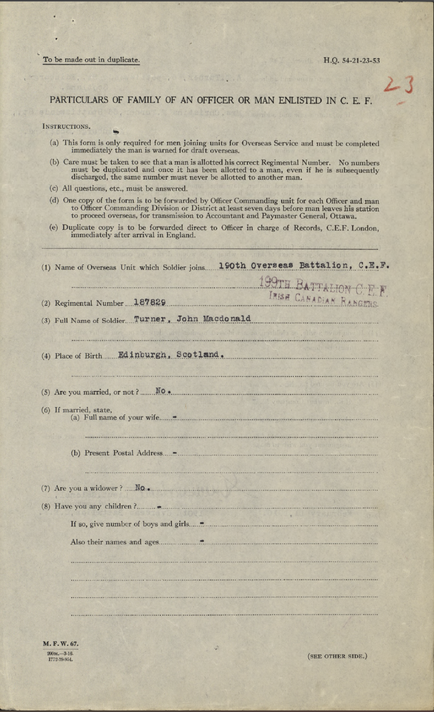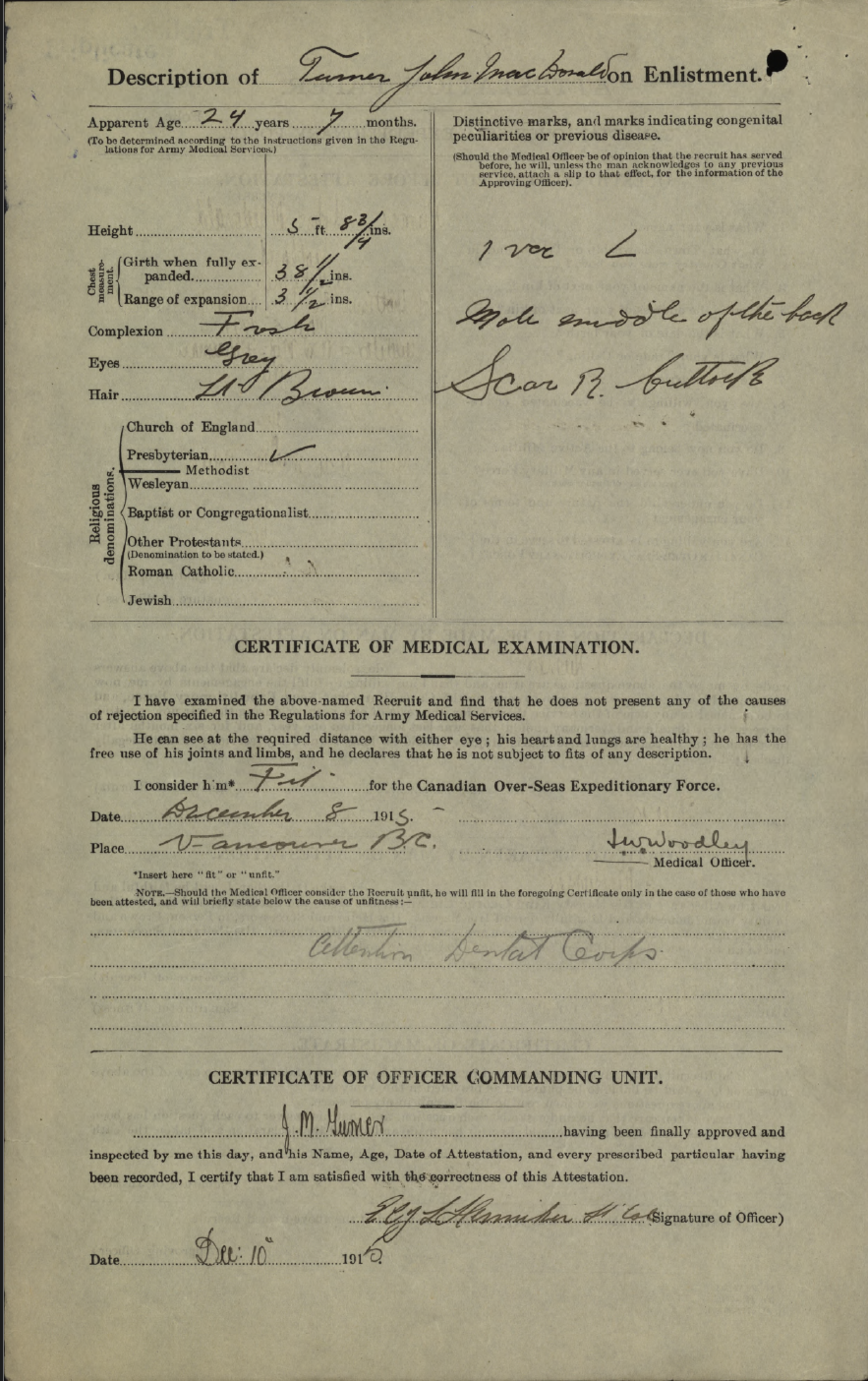 Family Search: When Lance-Corporal John Macdonald Turner was born on 5 May 1891, in Midlothian, Scotland, United Kingdom, his father, Alfred Thomas Turner, was 24 and his mother, Christian Ann Mc Donald, was 25. He married Ellen Warren on 23 November 1916, in Vancouver, British Columbia, Canada. They were the parents of at least 1 son. He immigrated to Eastport, Kootenai, Idaho, United States in 1937 and lived in Winnipeg, Manitoba, Canada in 1916 and Fairlight, Maryfield No. 91, Saskatchewan, Canada in 1922. He registered for military service in 1916. In 1916, at the age of 25, his occupation is listed as auditor/accountant. He died on 21 September 1983, in Vancouver, British Columbia, Canada, at the age of 92, and was buried in Mountain View Cemetery, Vancouver, British Columbia, Canada.