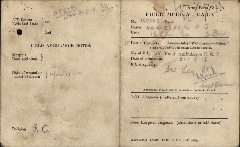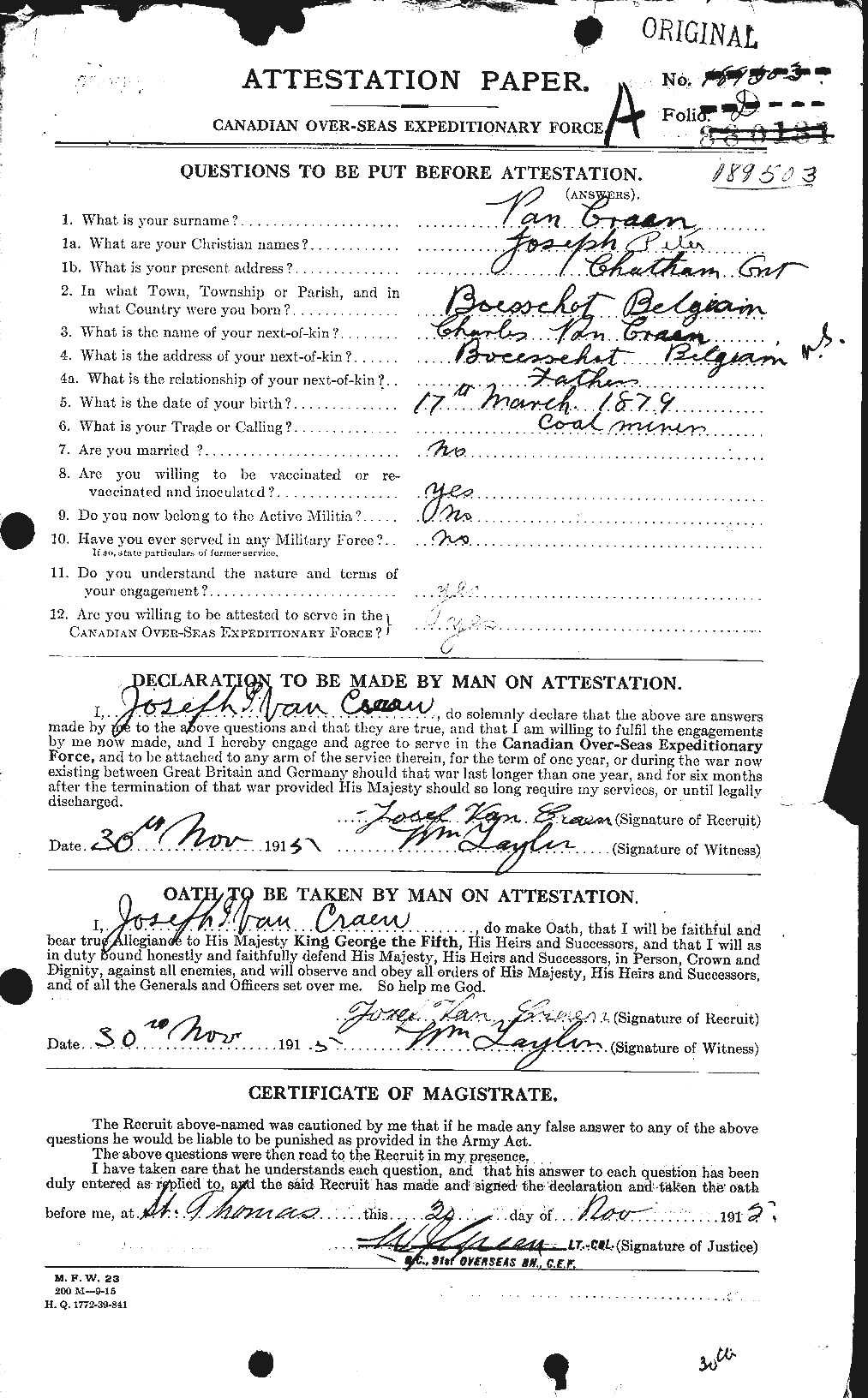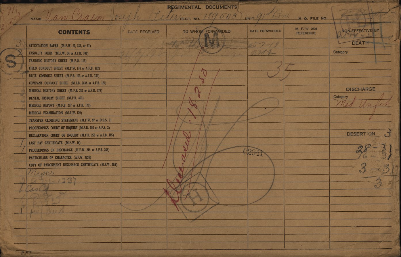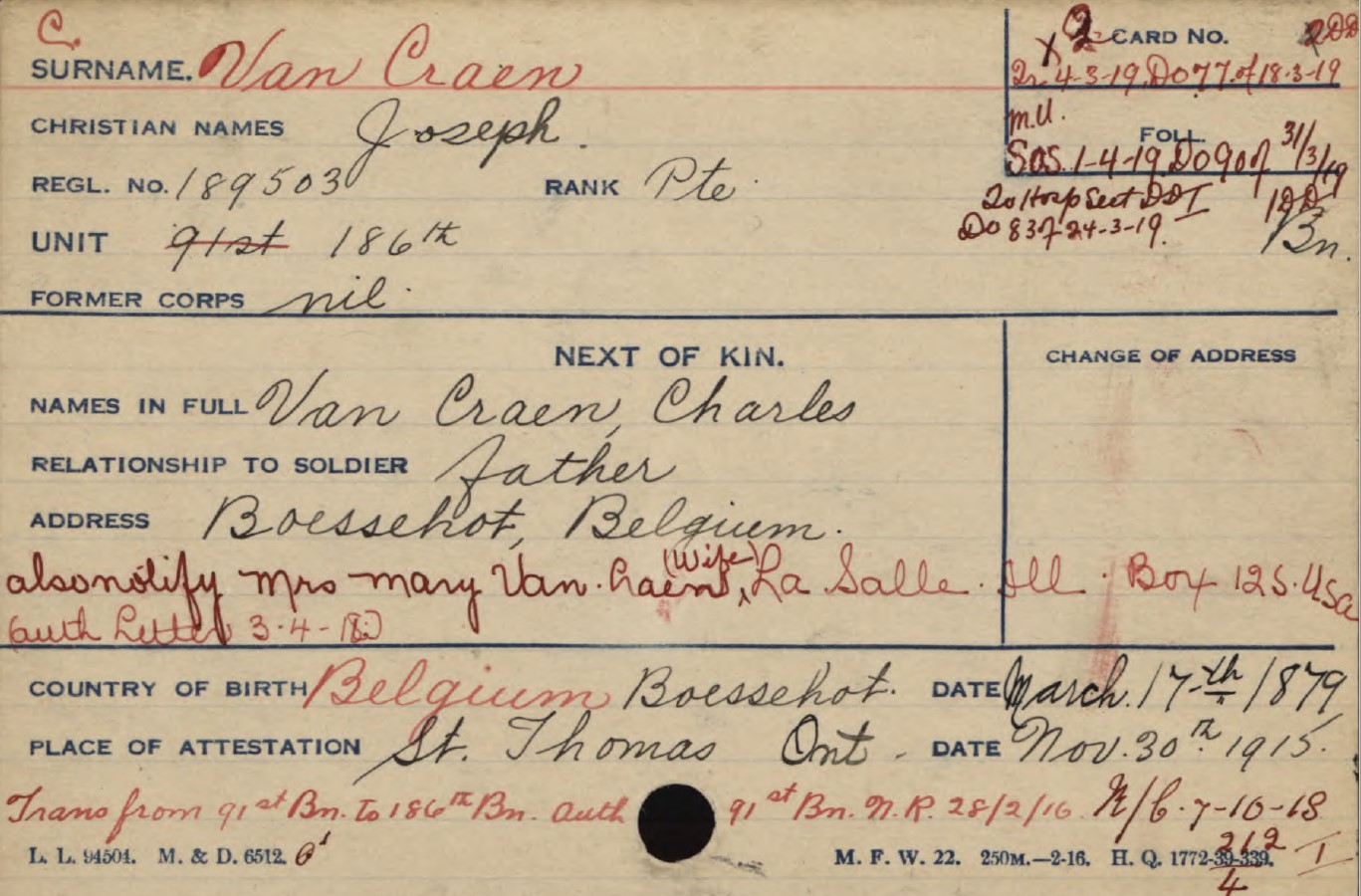 Van Craen, Joseph Peter: Service no. 189503 Digitized Service Record Source: Gathering Our Heroes. Find-A-Grave Van Craen, Joseph Peter: Service no. 189503. Source: Gathering Our Heroes. Share this: Click to email a link to a friend (Opens in new window) Email Click to share on Facebook (Opens in new window) Facebook Click to share on X (Opens in new window) X Click to share on Reddit (Opens in new window) Reddit Click to share on LinkedIn (Opens in new window) LinkedIn Click to print (Opens in new window) Print Click to share on Tumblr (Opens in new window) Tumblr Click to share on Pocket (Opens in new window) Pocket Click to share on Pinterest (Opens in new window) Pinterest Click to share on Telegram (Opens in new window) Telegram Click to share on WhatsApp (Opens in new window) WhatsApp Like Loading...