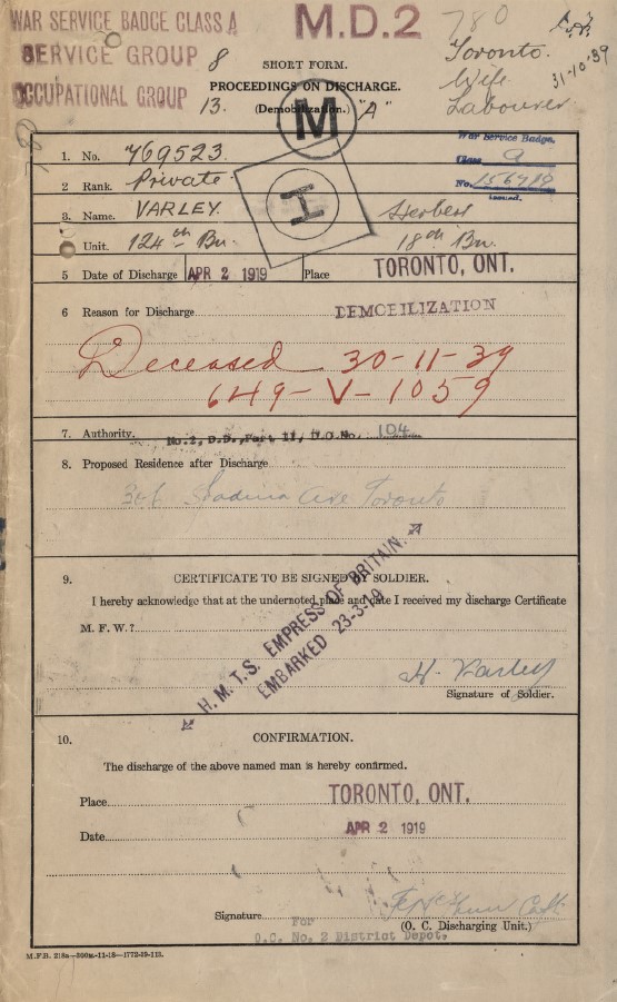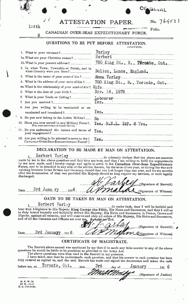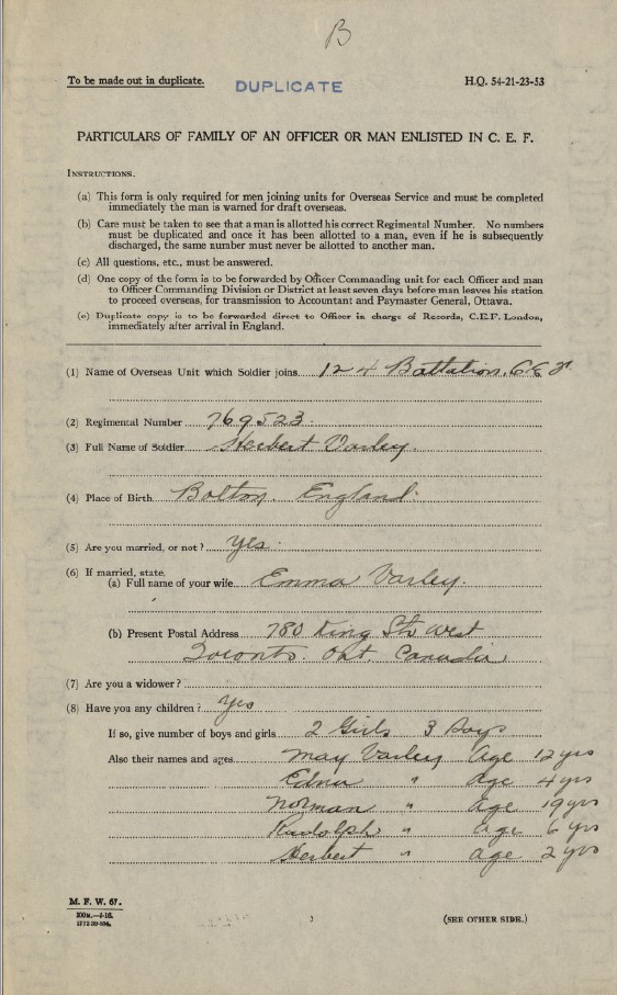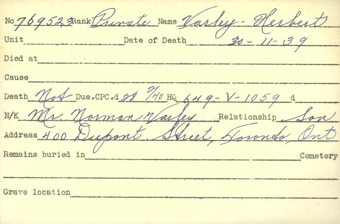 Father to Private John Norman Varley. His son joined under-aged but note the form below where his father states his son was 19-years old in 1916.