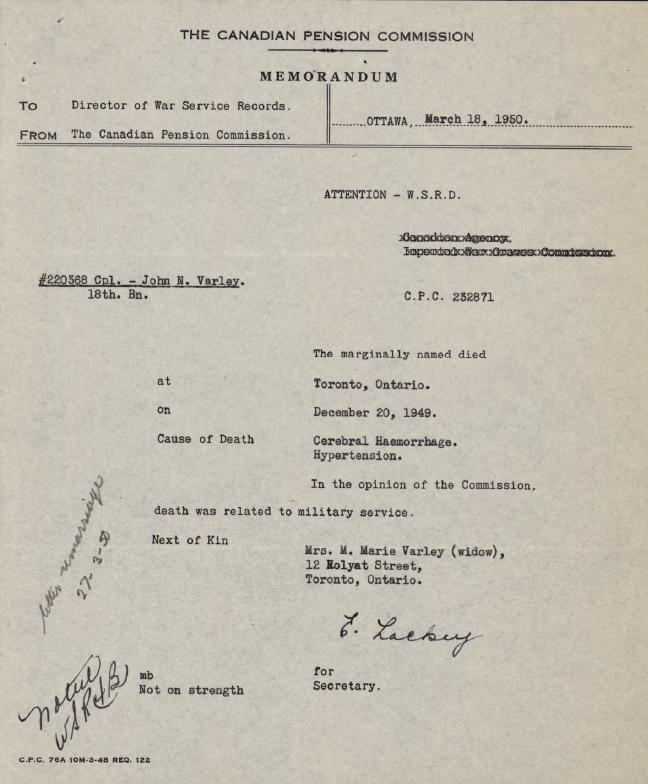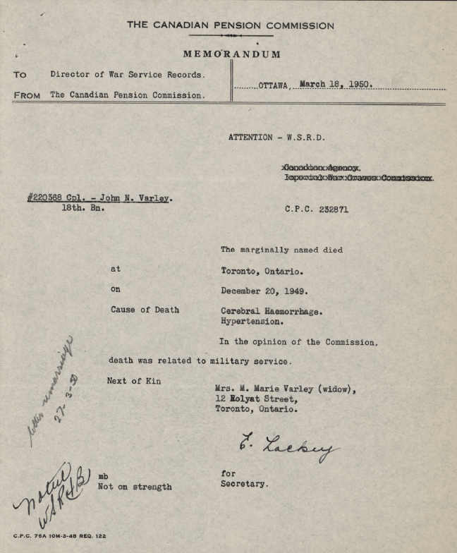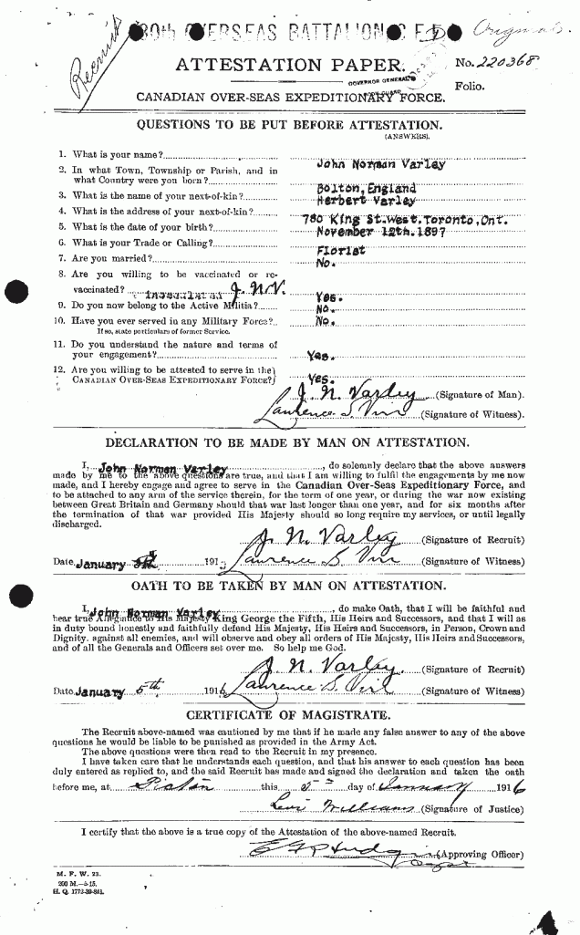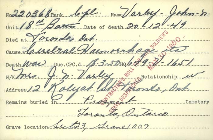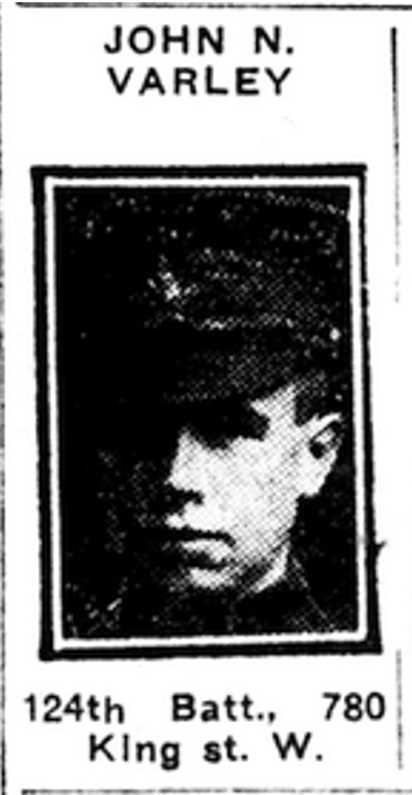 Varley, John Norman: Service no. 220368 Digitized Service Record Source: Per news clipping post by David Archer at 18th Battalion Facebook Page (not group). Find-A-Grave Under age. Varley, John Norman: Service no. 220368. Source: Toronto Telegram. January 1917. Via Per news clipping post by David Archer at 18th Battalion Facebook Page (not group). Share this: Click to email a link to a friend (Opens in new window) Email Click to share on Facebook (Opens in new window) Facebook Click to share on X (Opens in new window) X Click to share on Reddit (Opens in new window) Reddit Click to share on LinkedIn (Opens in new window) LinkedIn Click to print (Opens in new window) Print Click to share on Tumblr (Opens in new window) Tumblr Click to share on Pocket (Opens in new window) Pocket Click to share on Pinterest (Opens in new window) Pinterest Click to share on Telegram (Opens in new window) Telegram Click to share on WhatsApp (Opens in new window) WhatsApp Like Loading...
