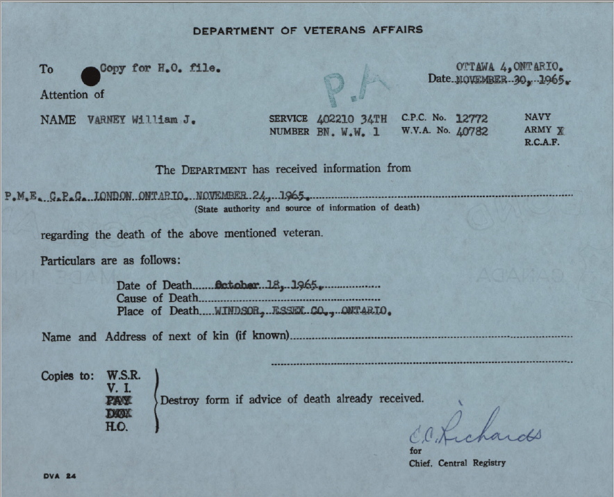 Varney, William John: Service no. 402210 Digitized Service Record Source: Witness to attempted suicide of Sergeant Jack Vickerman. Part of a statement in Vickerman’s service file. Find-A-Grave Share this: Click to email a link to a friend (Opens in new window) Email Click to share on Facebook (Opens in new window) Facebook Click to share on X (Opens in new window) X Click to share on Reddit (Opens in new window) Reddit Click to share on LinkedIn (Opens in new window) LinkedIn Click to print (Opens in new window) Print Click to share on Tumblr (Opens in new window) Tumblr Click to share on Pocket (Opens in new window) Pocket Click to share on Pinterest (Opens in new window) Pinterest Click to share on Telegram (Opens in new window) Telegram Click to share on WhatsApp (Opens in new window) WhatsApp Like Loading...