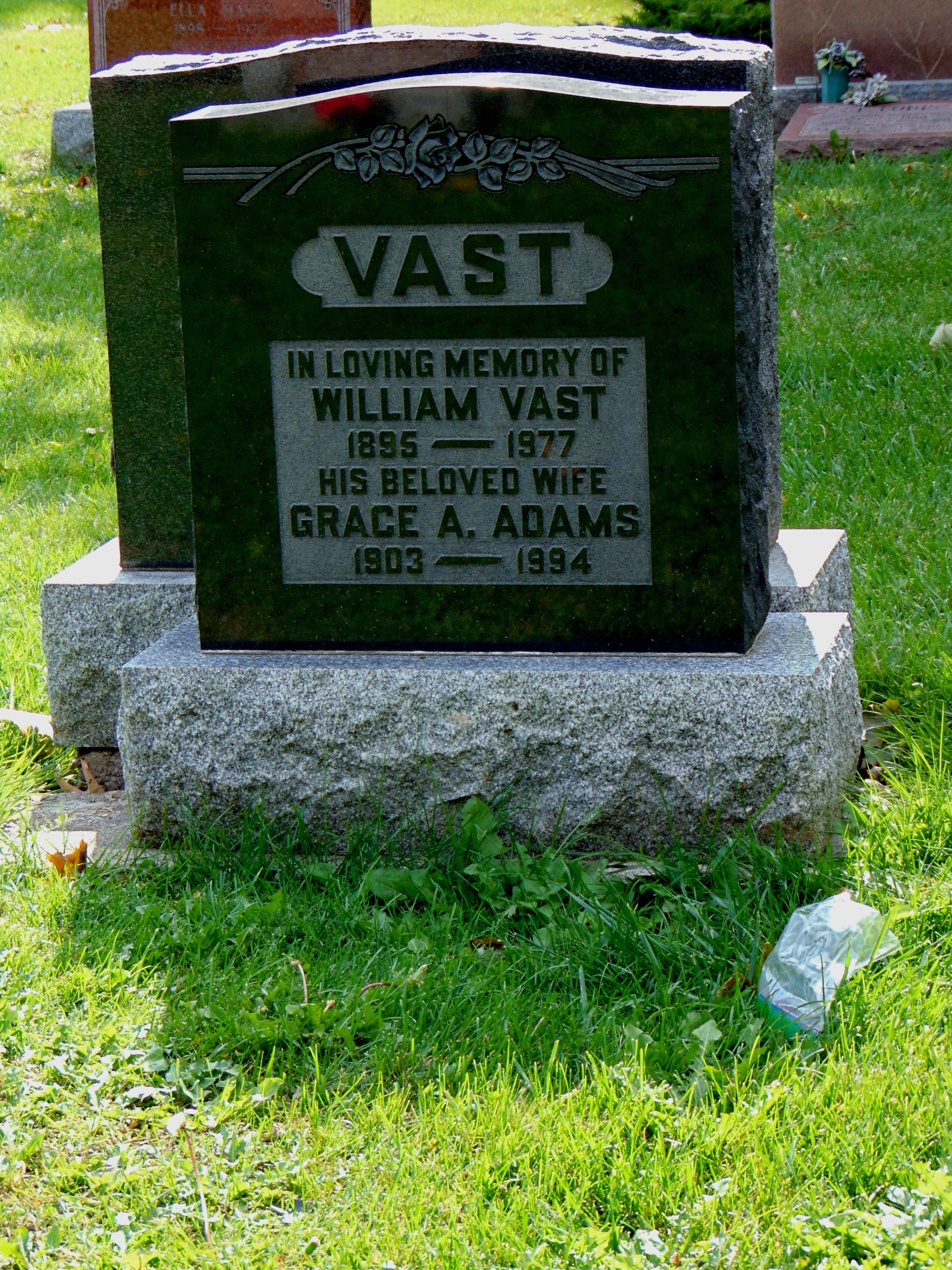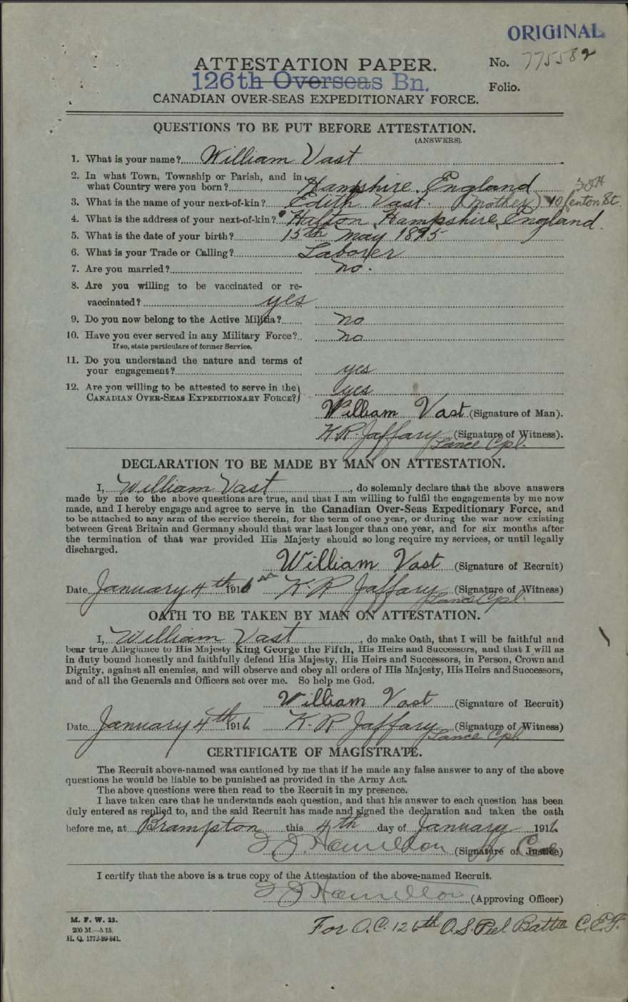 Family Search: Private William Vast was born on 15 May 1895, in Hampshire, England, United Kingdom as the son of Albert Alexander Vast and Edith. He immigrated to St. John, New Brunswick, Canada in 1912 and lived in Alton, Hampshire, England, United Kingdom in 1911 and Brampton, Peel, Ontario, Canada in 1921. He registered for military service in 1916. In 1916, at the age of 21, his occupation is listed as labourer in Churchville, Brampton, Peel, Ontario, Canada. He died in 1977, at the age of 82, and was buried in Brampton Cemetery, Brampton, Peel, Ontario, Canada.