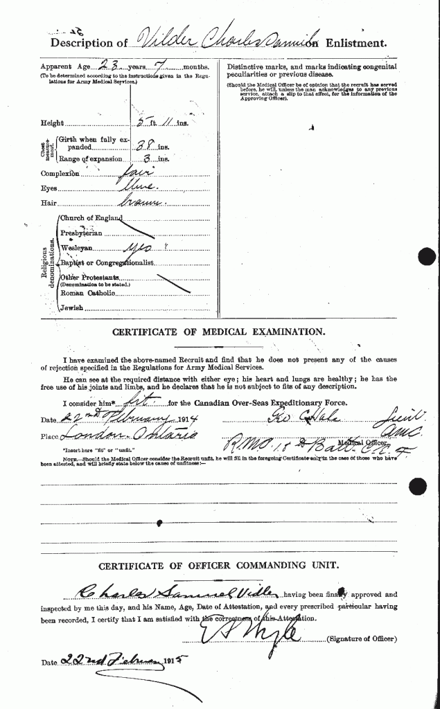 Charles enlisted in the CEF on 22 February, 1915 at London, ON. at the age of 23 years, 7 months. 5’ 11”, Complexion: Fair, Eyes: Blue, Hair: Brown. He was considered “Fit” 22/02/1914 at London, ON. to the 18th Battalion, and he served overseas in the 18th Battalion, CEF.