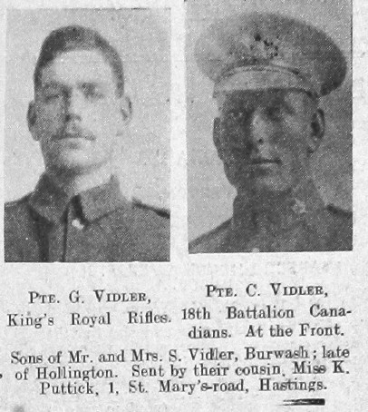 Born in Hustings, Dover, England 15 July, 1891. The son of Samuel Vidler of Witherenden Cottages, Stone Gate, Tichurst, England. His mother Mrs. S. Vidler was living at Withineu Hill, Burwash, Sussex, England. He immigrated to Canada in 1913 looking for work in the farming industry. At the time he was living at R.R. #2 Blenheim.