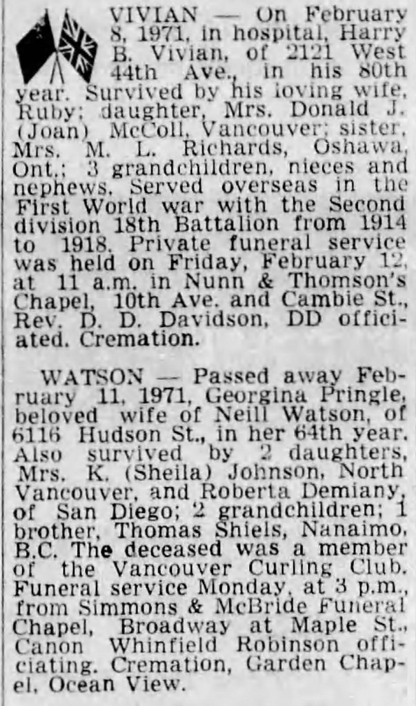 Family Search: When Private Harry Ballantyne Vivian was born on 3 September 1891, in Stratford, Perth, Ontario, Canada, his father, Alexander Ritson Vivian, was 33 and his mother, Helen Agnes Todd, was 35. He had at least 1 daughter with Ruby Belle Pickwell. He lived in Perth, Ontario, Canada in 1911 and Vancouver, British Columbia, Canada in 1938. He registered for military service in 1914. In 1914, at the age of 23, his occupation is listed as machinst in Stratford, Perth, Ontario, Canada. He died on 8 February 1971, in Essondale, Coquitlam, British Columbia, Canada, at the age of 79.