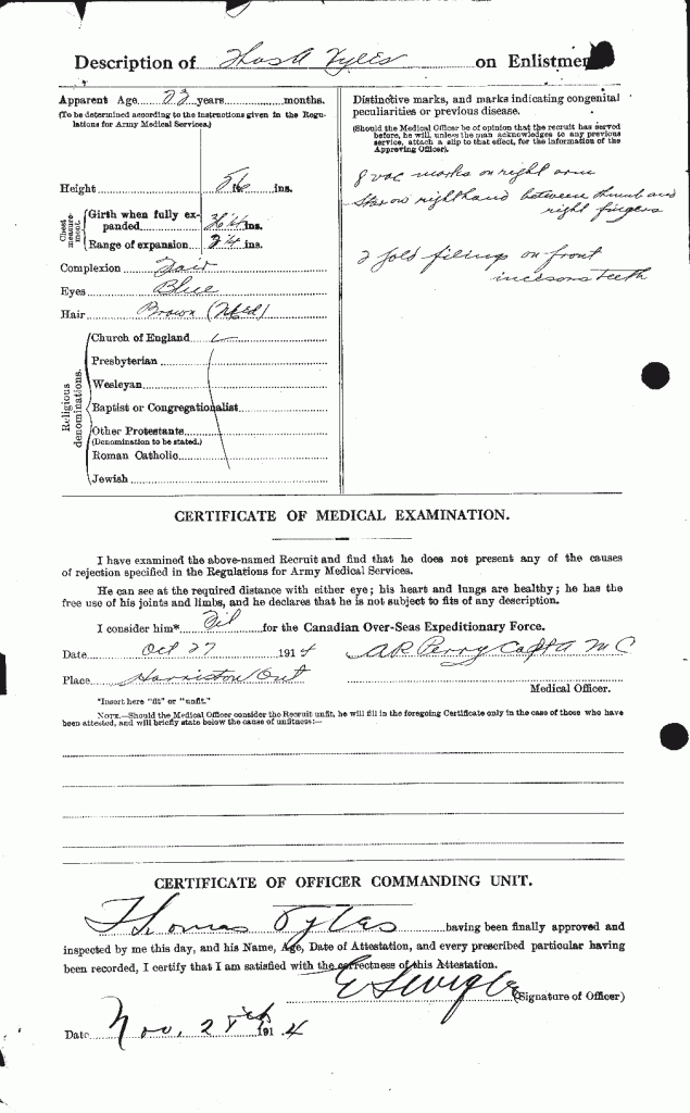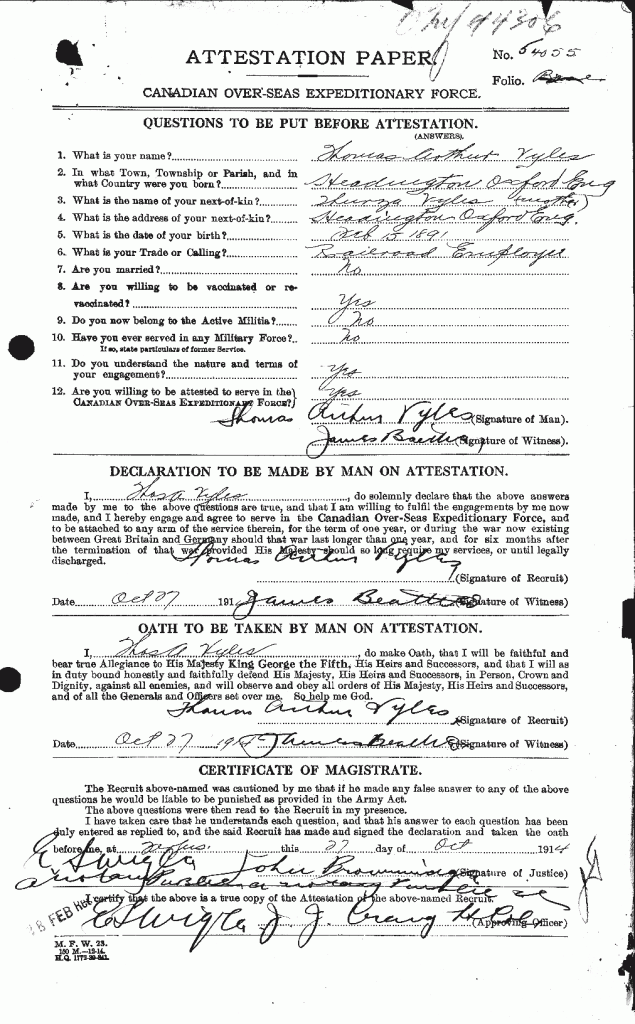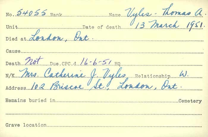 Family Search: When Thomas Arthur Vyles was born on 15 February 1891, in Headington, Oxfordshire, England, United Kingdom, his father, Richard Vyles, was 47 and his mother, Maria Thurza Nutt, was 43. He married Catherine Jane Ducklow on 25 June 1919, in Listowel, North Perth, Perth, Ontario, Canada. They were the parents of at least 1 son. He immigrated to Canada in 1912 and lived in Toronto, Ontario, Canada in 1923. He registered for military service in 1914. In 1914, at the age of 23, his occupation is listed as railroad employee. He died on 13 March 1951, in London, Ontario, Canada, at the age of 60, and was buried in Forest Lawn Memorial Gardens, London, Ontario, Canada.