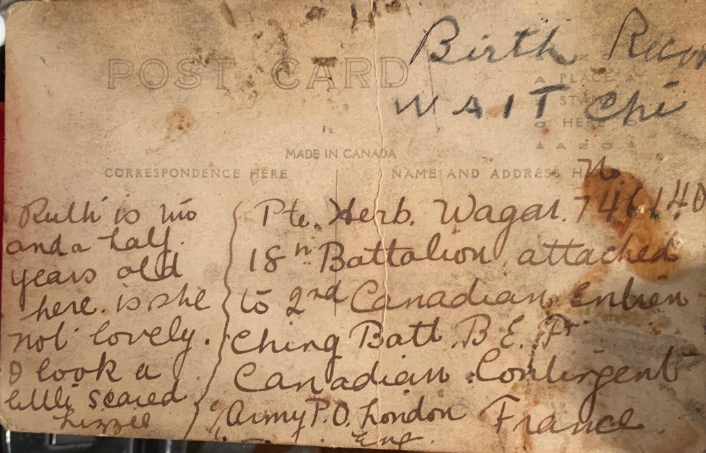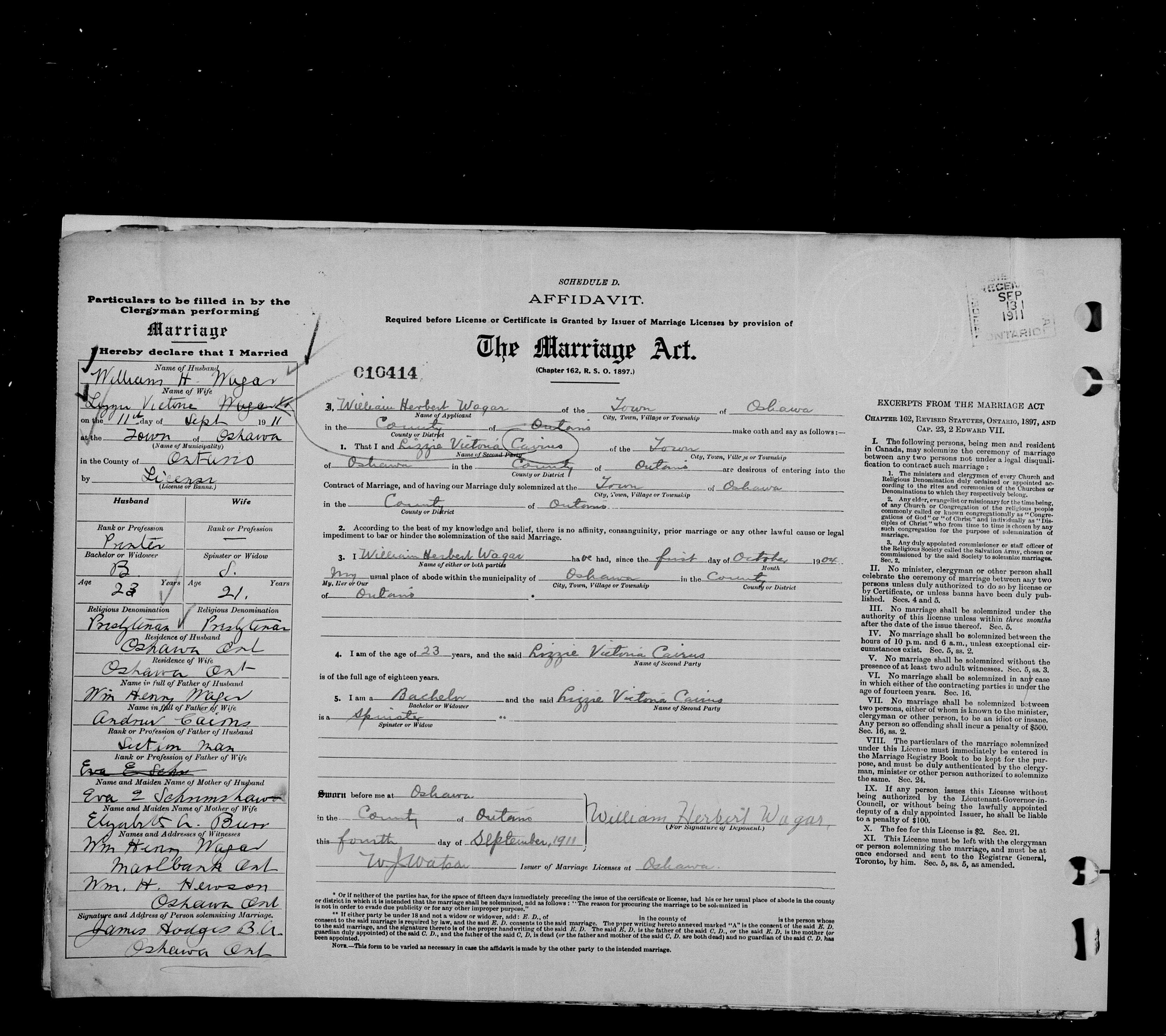 Family Search: When William Herbert Wagar was born on 13 May 1888, in Deseronto, Hastings, Ontario, Canada, his father, William Henry Wagar, was 28 and his mother, Eva Eliza Schrimshaw, was 22. He married Elizabeth Victoria Cairns on 11 September 1911, in Oshawa, Durham, Ontario, Canada. They were the parents of at least 1 daughter. He lived in Ontario, Canada in 1901 and Oshawa, Ontario, Ontario, Canada in 1922. He registered for military service in 1916. In 1916, at the age of 28, his occupation is listed as printer in Oshawa, Ontario, Ontario, Canada. He died on 6 September 1961, at the age of 73, and was buried in Dryden Baptist Cemetery, Whitby, Ontario, Ontario, Canada.