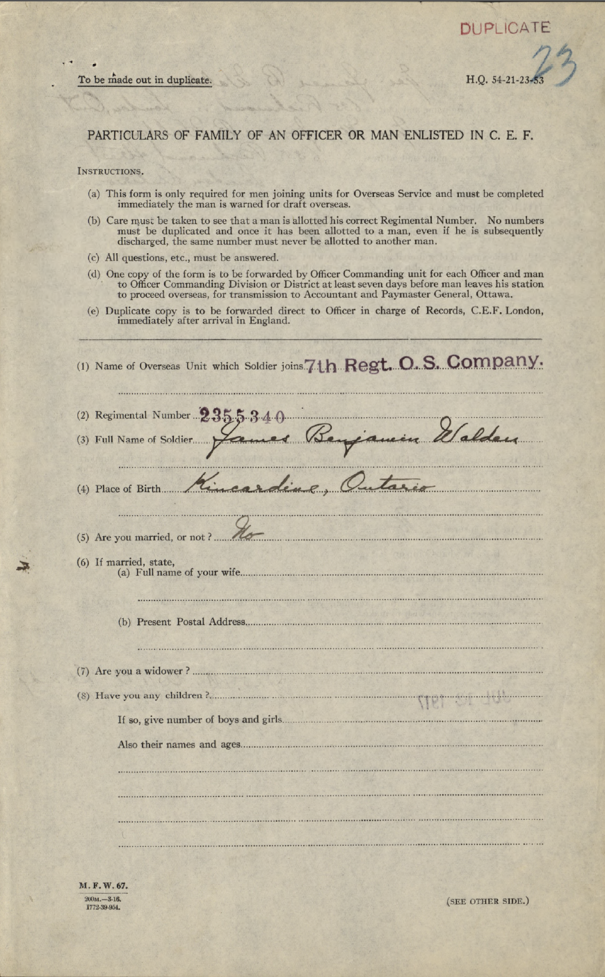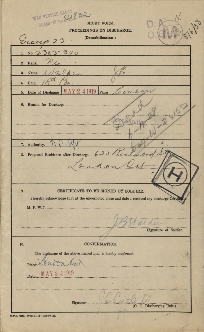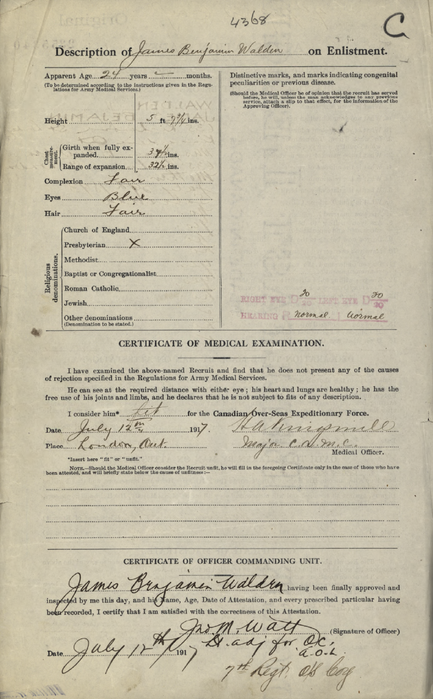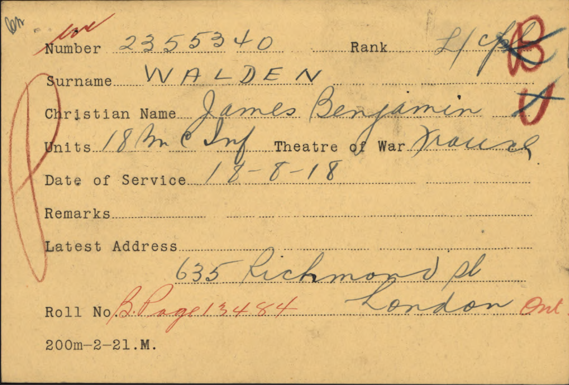 Family Search: When Private James Benjamin Walden Jr. was born on 29 July 1893, in Kincardine, Bruce, Ontario, Canada, his father, James Benjamin Walden Sr., was 26 and his mother, Margaret Elizabeth Corey, was 23. He married Josephine Alberta Waldron on 3 November 1921, in Toronto, Ontario, Canada. They were the parents of at least 1 son and 1 daughter. He immigrated to United States in 1910 and lived in Grey, Ontario, Canada in 1901. He registered for military service in 1917. In 1928, at the age of 35, his occupation is listed as automotive supply business, owner in London, Ontario, Canada. He died on 6 November 1928, in London, Ontario, Canada, at the age of 35, and was buried in Mount Pleasant Cemetery, West McGillivray, Middlesex, Ontario, Canada.