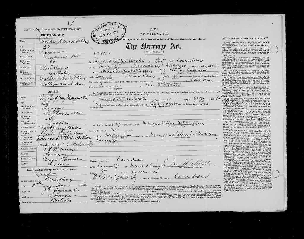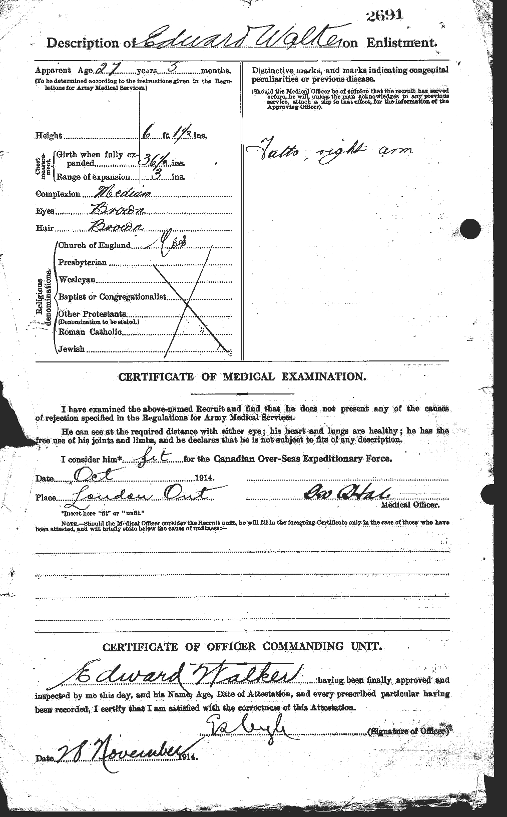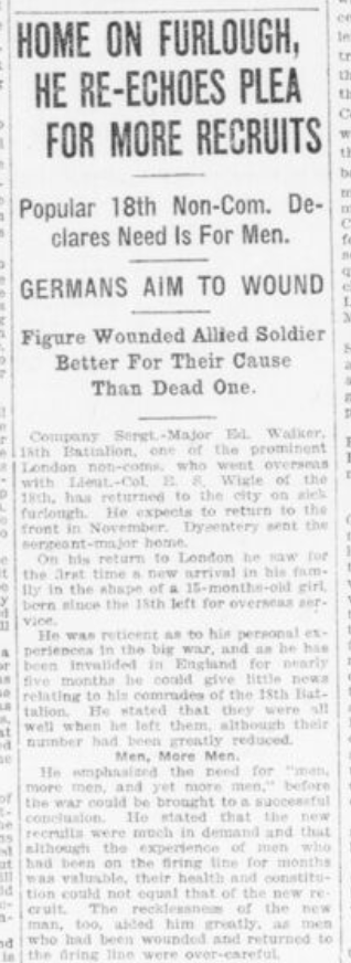 Company Sergt.-Major Ed. Walker, 18th Battalion, one of the prominent London non-coms. who went overseas with Lieut.-Col. E.S. Wigle of the 18th, has returned to the city on sick furlough. He expects to return to the front in November. Dysentery sent the sergeant-major home.