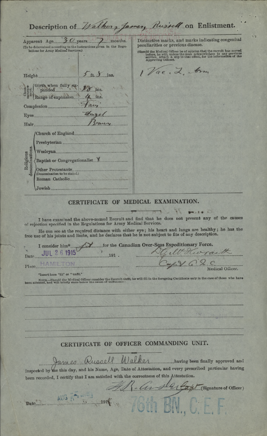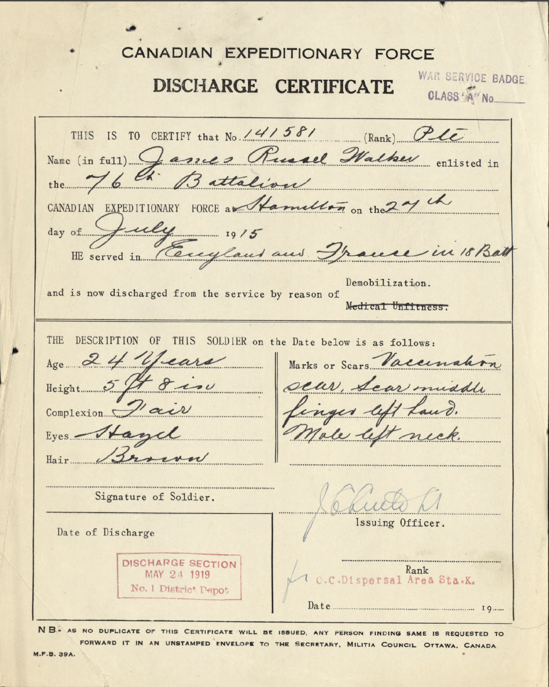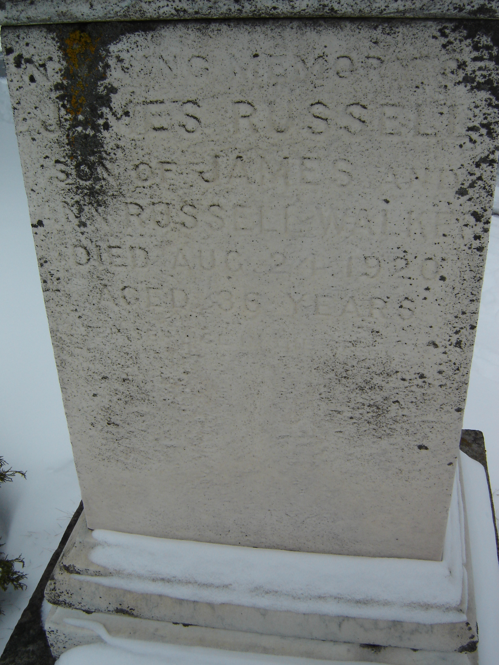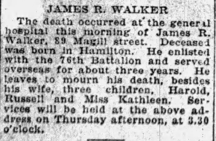 Family Search: When Private James Russell Walker was born on 9 December 1884, in Hamilton, Wentworth, Ontario, Canada, his father, James Walker, was 78 and his mother, Ann Russell, was 44. He married Ella Elizabeth Best on 17 July 1907, in Collingwood, Simcoe, Ontario, Canada. They were the parents of at least 2 sons and 1 daughter. He lived in Hamilton, Ontario, Canada in 1891. He registered for military service in 1915. In 1915, at the age of 31, his occupation is listed as railroad clerk in Hamilton, Wentworth, Ontario, Canada. He died on 24 August 1920, in Hamilton, Wentworth, Ontario, Canada, at the age of 35, and was buried in Hamilton Cemetery, Hamilton, Ontario, Canada.