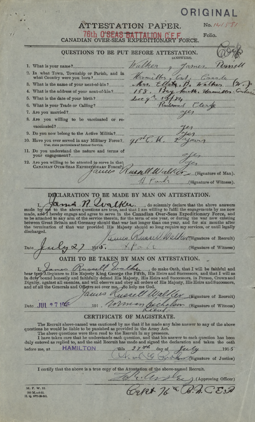 This man enlisted with the 76th Overseas Battalion CEF on 27 July 1915, at Hamilton, Ontario. He was a Railroad Clerk living at 158 Bay Street, Hamilton. His regimental number was 141581.