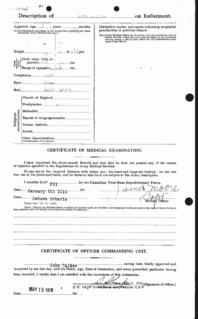 Family Search: John Walker was born on 7 February 1878, in Glasgow, Scotland, United Kingdom. He had at least 3 sons and 4 daughters with Mary Walker. He immigrated to Canada in 1913 and lived in Oshawa, Ontario, Ontario, Canada in 1916. He registered for military service in 1916. In 1916, at the age of 38, his occupation is listed as carpenter in Oshawa, Ontario, Ontario, Canada. He died on 29 January 1958, in London, Ontario, Canada, at the age of 79.